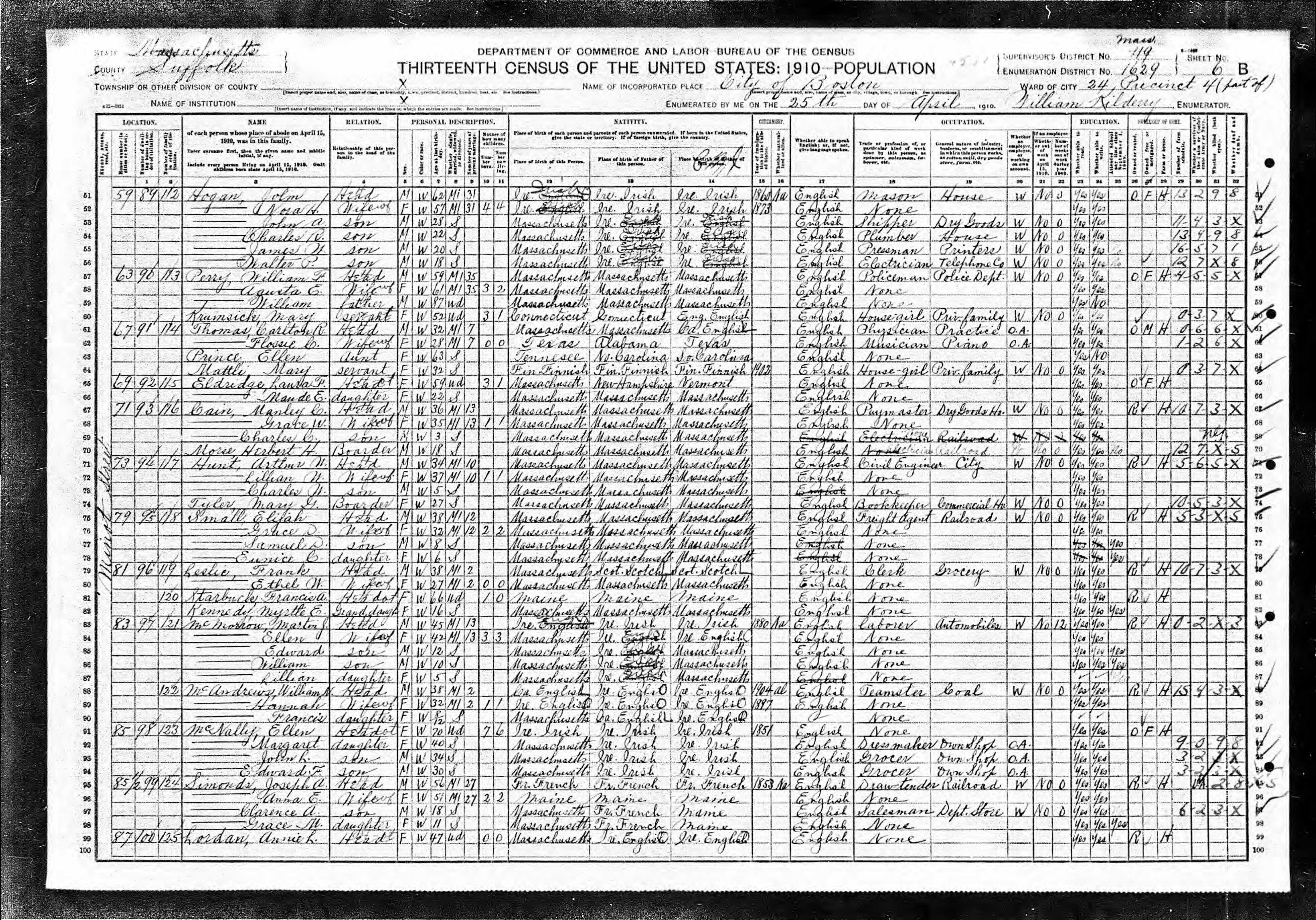 Residences1904 - Roslindale, Suffolk, Massachusetts | 1910 - Boston, Suffolk, Massachusetts 1920 - Boston, Suffolk, Massachusetts 1930 - Boston, Suffolk, Massachusetts 1935 - Boston, Suffolk, Massachusetts |