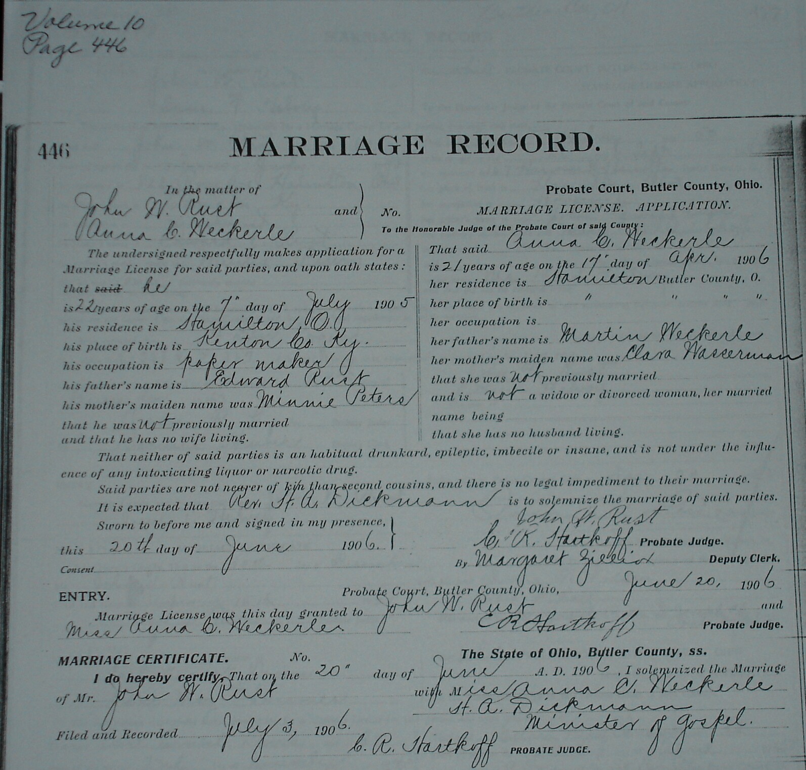 Residences1883 - Kenton County, Kentucky | 1900 - Addyston, Hamilton, Ohio 1910 - St Clair, Butler, Ohio 1920 - Hamilton, Butler, Ohio | 1930 - Hamilton, Butler, Ohio | 1940 - Hamilton, Butler, Ohio 1950 - Hamilton, Butler, Ohio 1965 - Hamilton, Butler, Ohio |