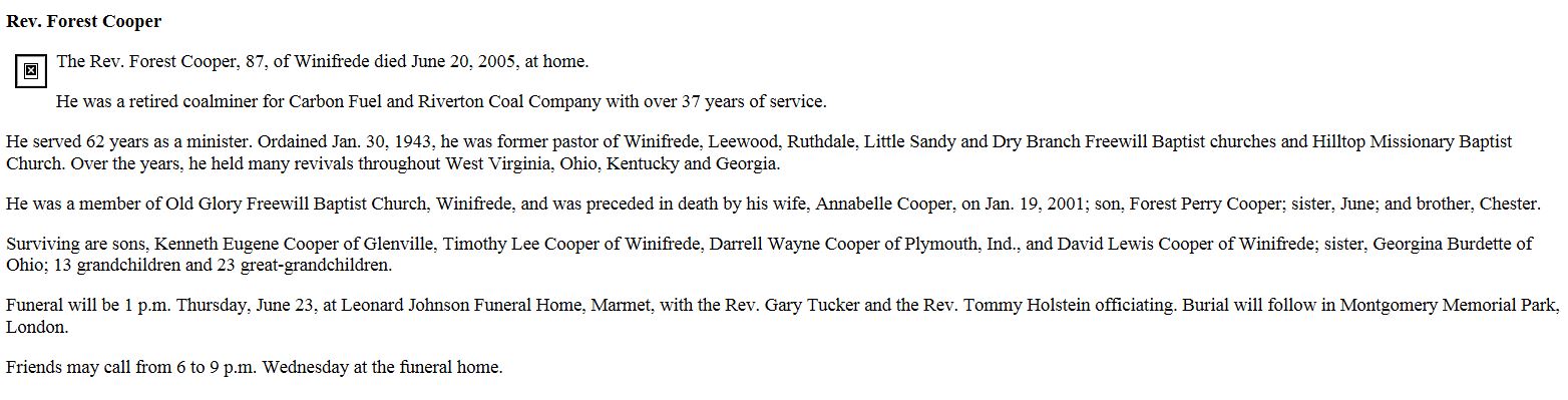 Residences1920 - West Virginia | 1930 - Cabin Creek, Kanawha, West Virginia 1940 - Cabin Creek, Kanawha, West Virginia 2001 - Winifrede, Kanawha, West Virginia, USA |