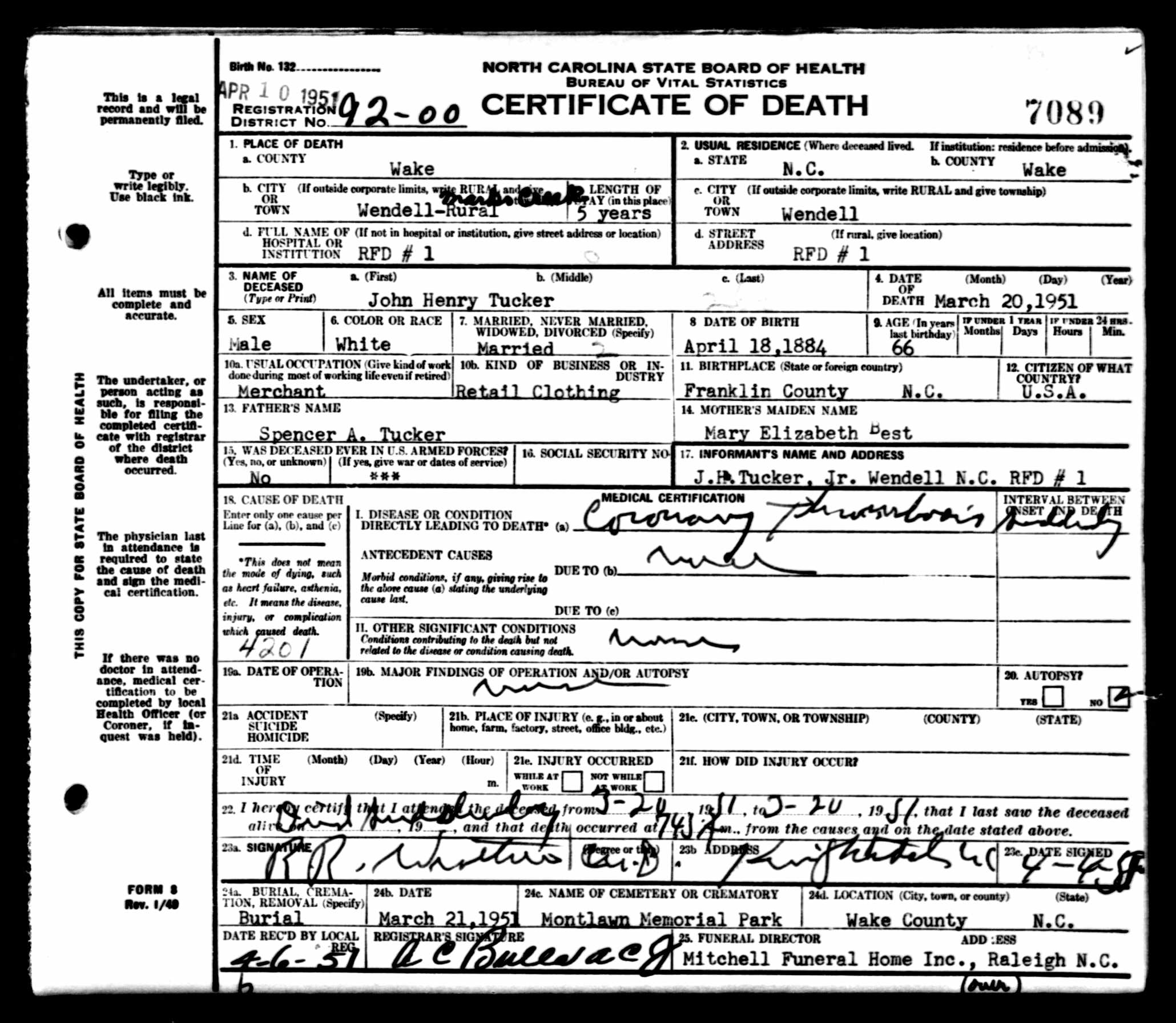Residences1886 - Franklin County, North Carolina | 1900 - Louisburg, Franklin, North Carolina 1910 - Louisburg, Franklin, North Carolina 1930 - Henderson, Vance, North Carolina 1935 - Henderson, North Carolina |