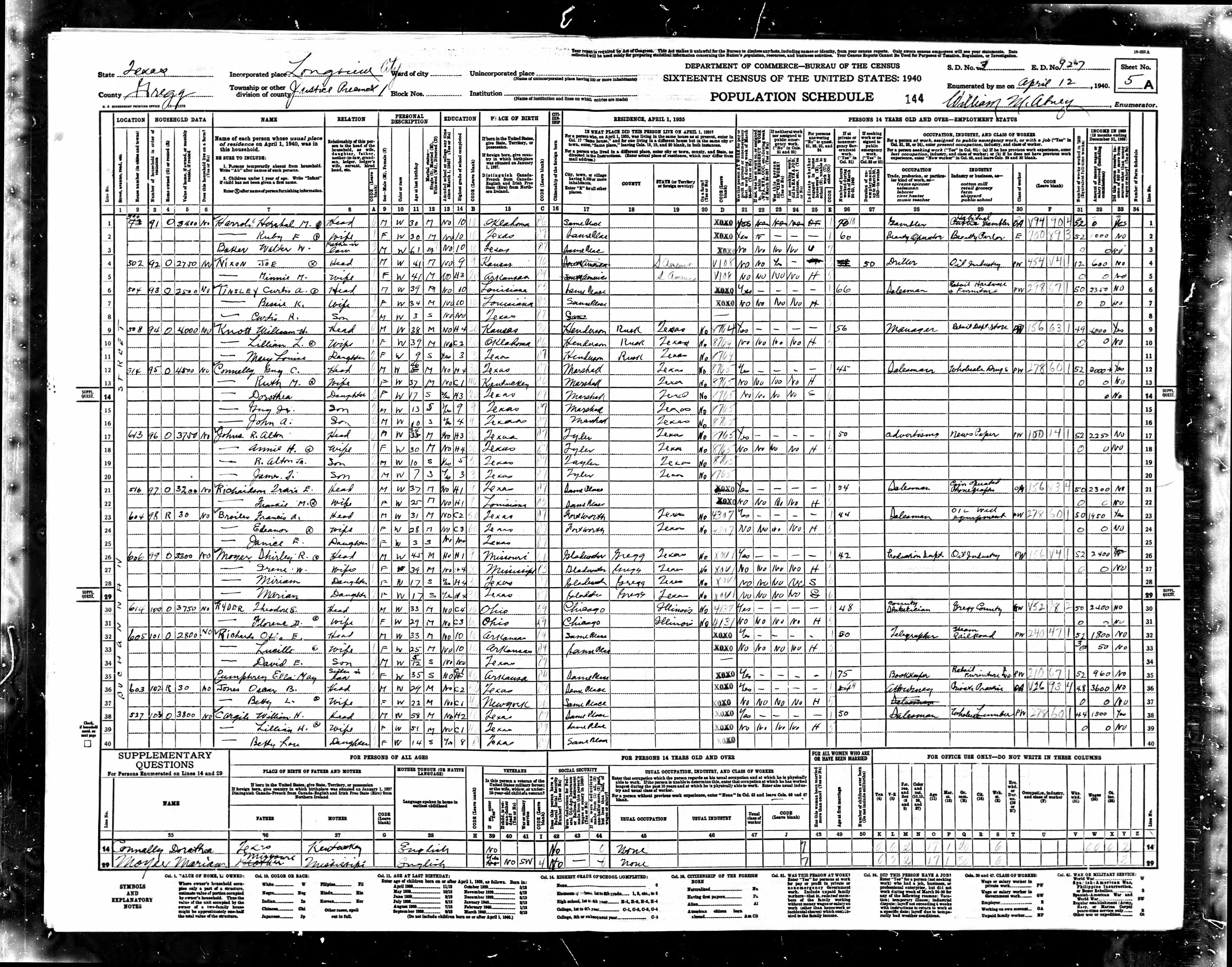 Residences1900 - Louisiana | 1910 - Haynesville, Claiborne, Louisiana 1920 - Claiborne, Louisiana 1940 - Longview, Gregg, Texas 1965 - Louisiana |
