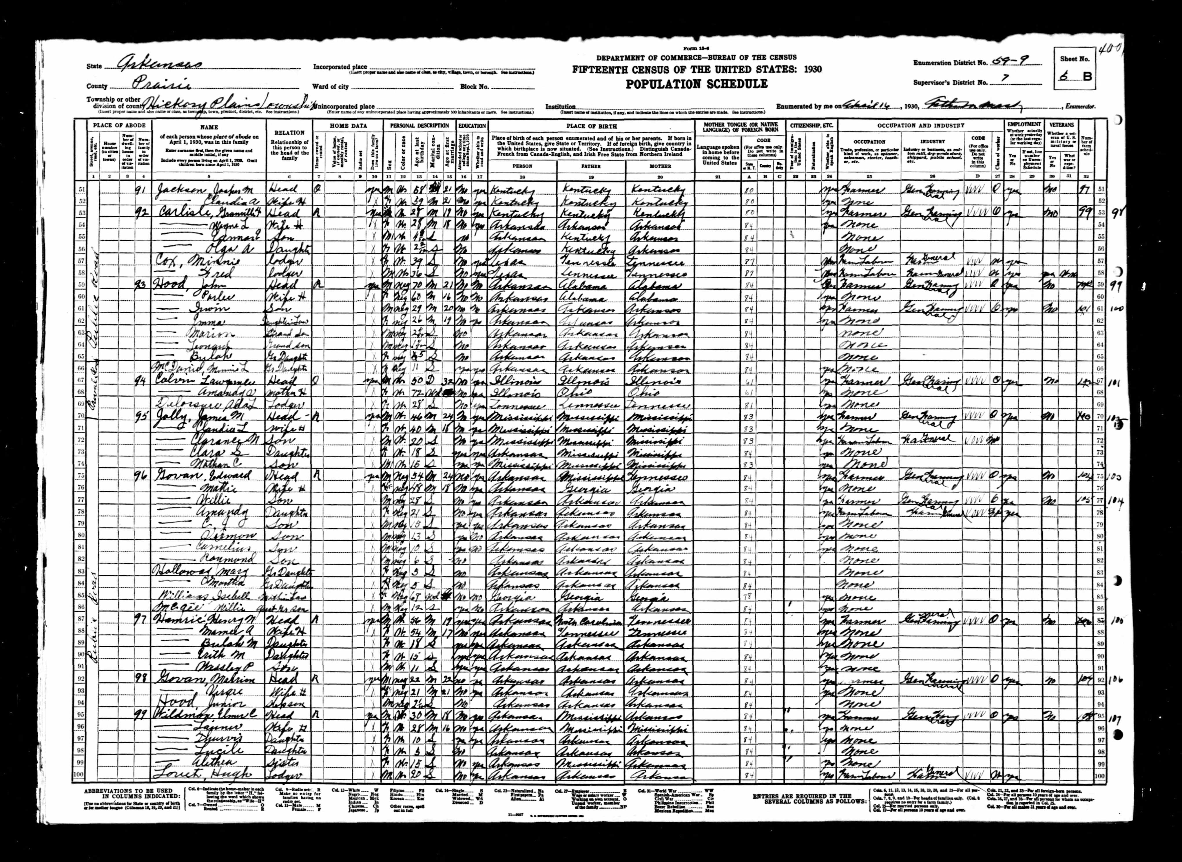 Residences1889 - Neshoba County, Mississippi | 1900 - Philadelphia, Neshoba, Mississippi 1910 - Neshoba, Mississippi 1920 - Philadelphia, Neshoba, Mississippi 1930 - Hickory Plain, Prairie, Arkansas |