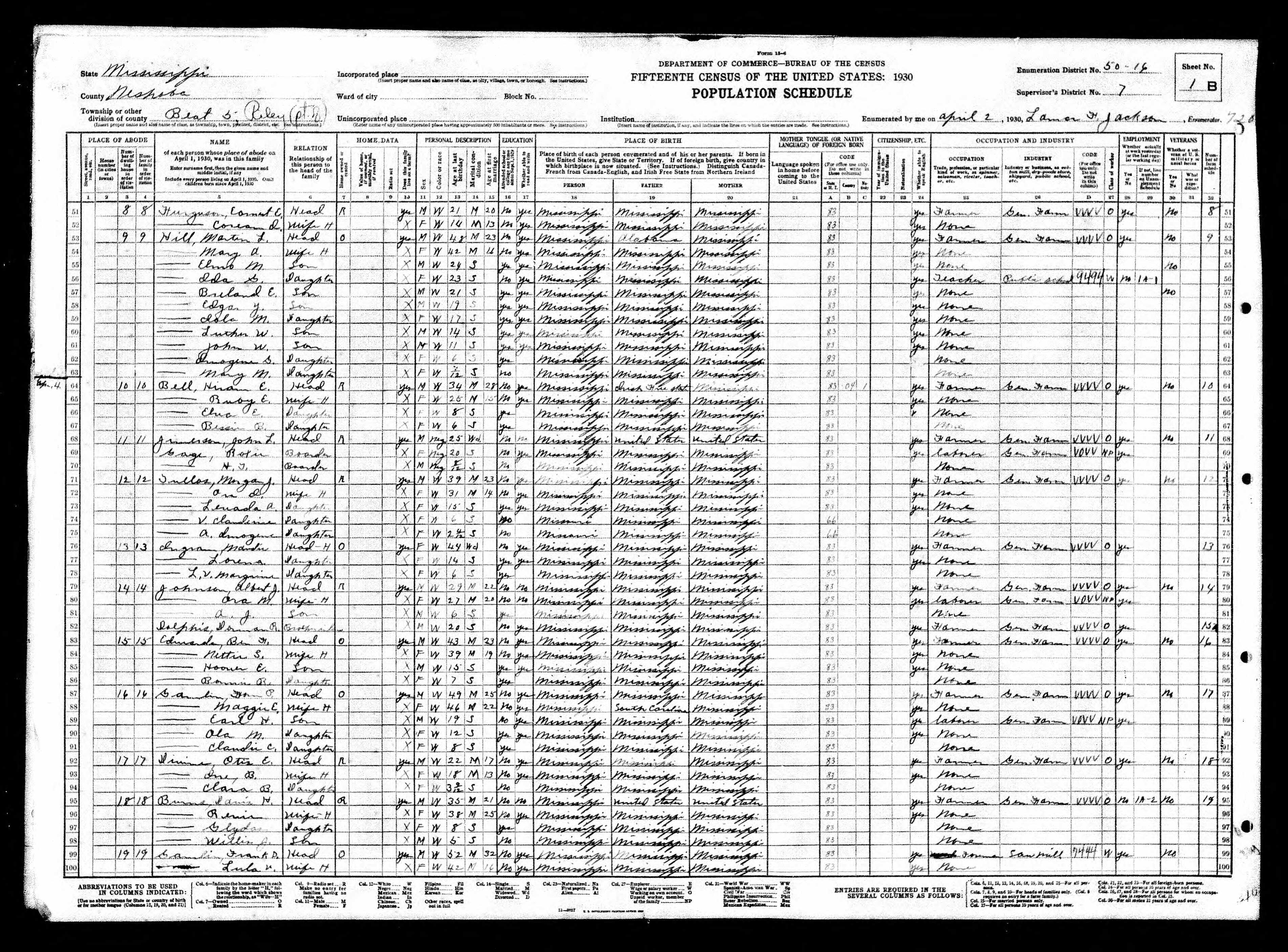 Residences1890 - Neshoba County, Mississippi | 1900 - Riley, Neshoba, Mississippi 1910 - Burnside, Neshoba, Mississippi 1920 - Center, Attala, Mississippi 1930 - Riley, Neshoba, Mississippi 1940 - Riley, Neshoba, Mississippi |