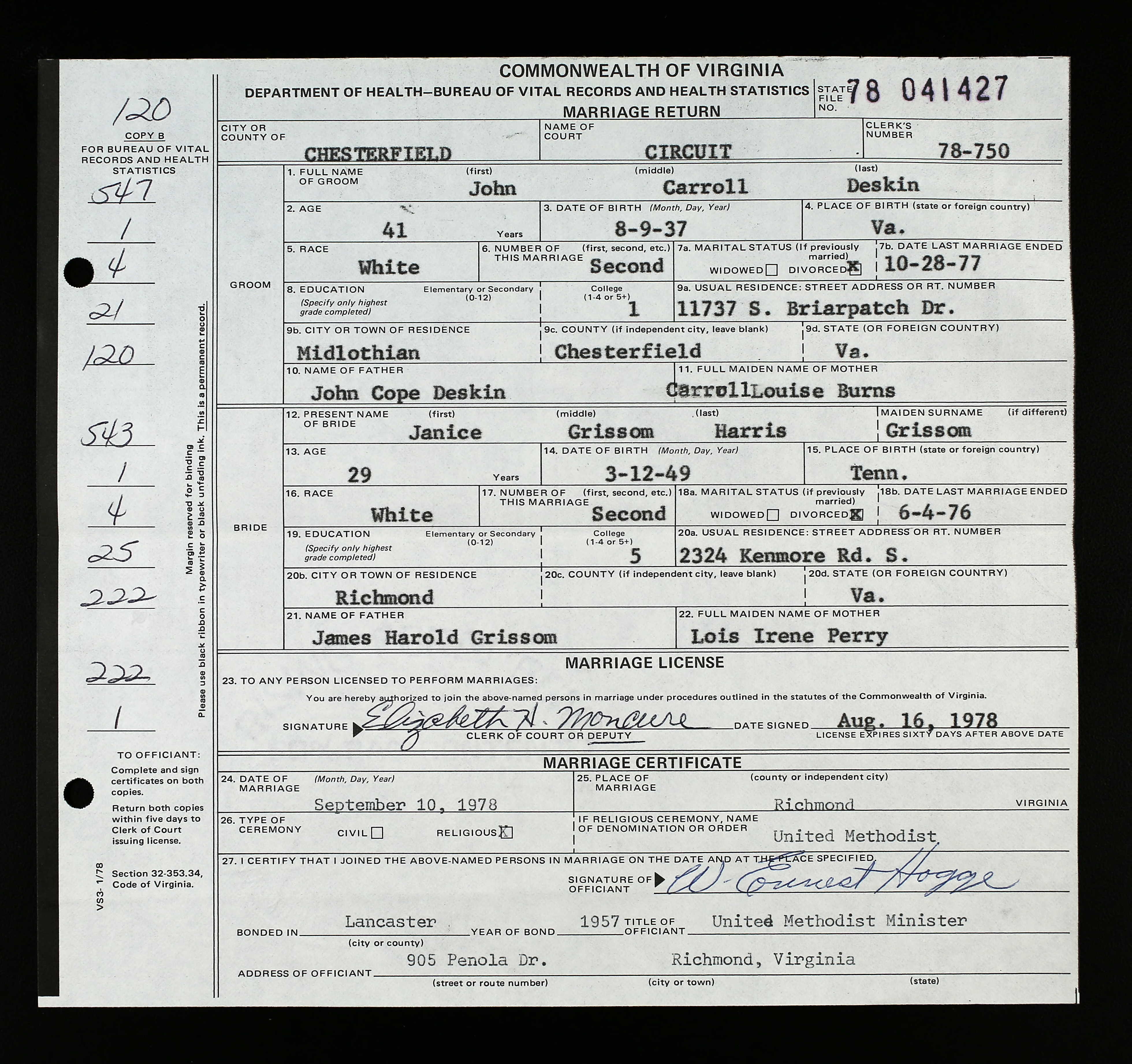 | John Cope Deskin & Carroll Louise Burns | |