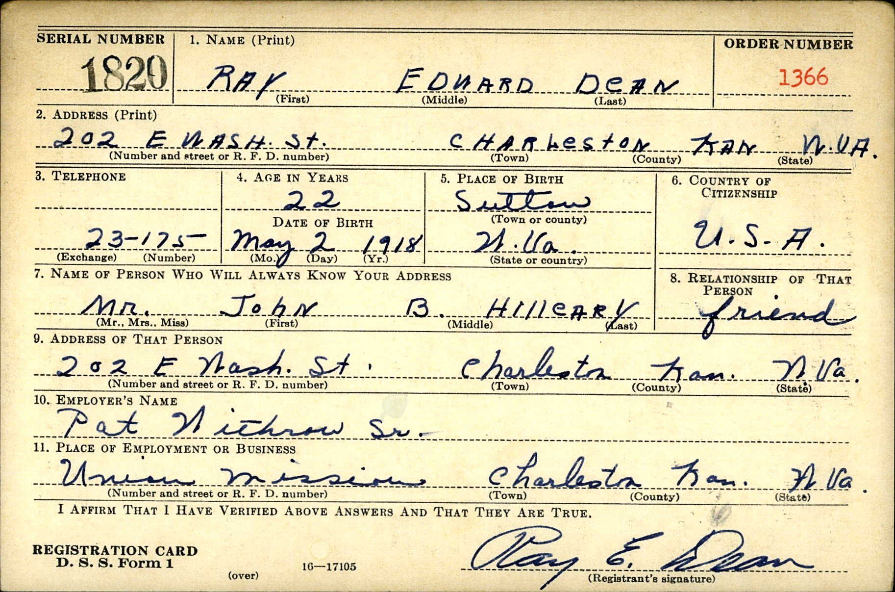 Residences1918 - West Virginia | 1920 - Fayetteville, Fayette, West Virginia 1930 - South Charleston, Kanawha, West Virginia 1940 - South Charleston, Kanawha, West Virginia 1950 - Bethlehem, Ohio, West Virginia |