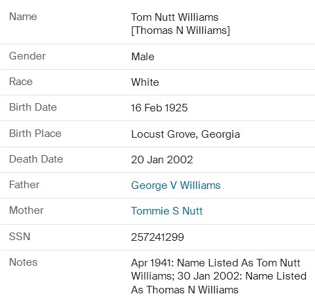 Residences1925 - Locust Grove, Henry, Georgia | 1930 - Tussahaw, Henry, Georgia 1940 - Locust Grove, Henry, Georgia 1950 - Hapeville, Fulton, Georgia 2002 - , Williamson, Pike, Georgia, USA |