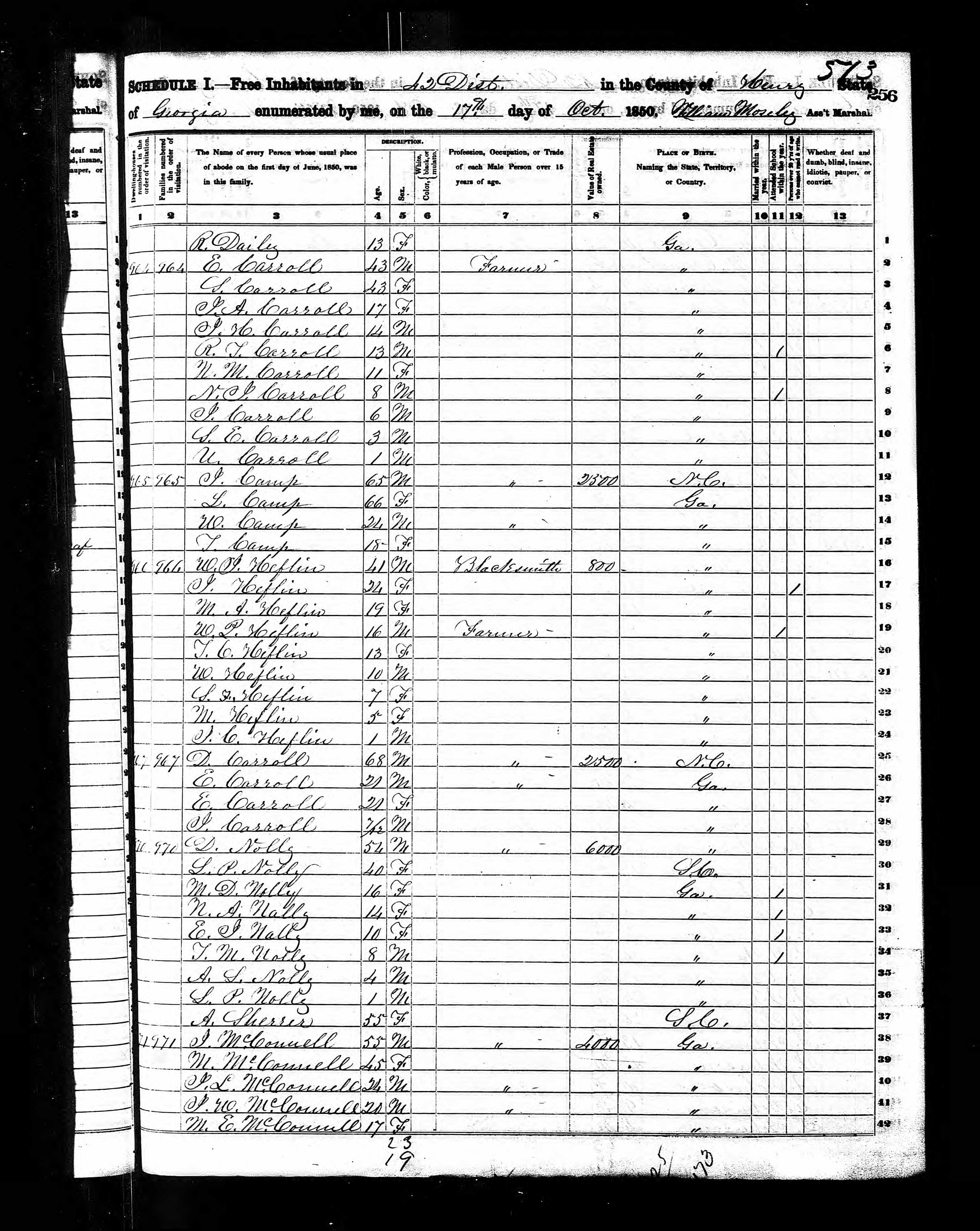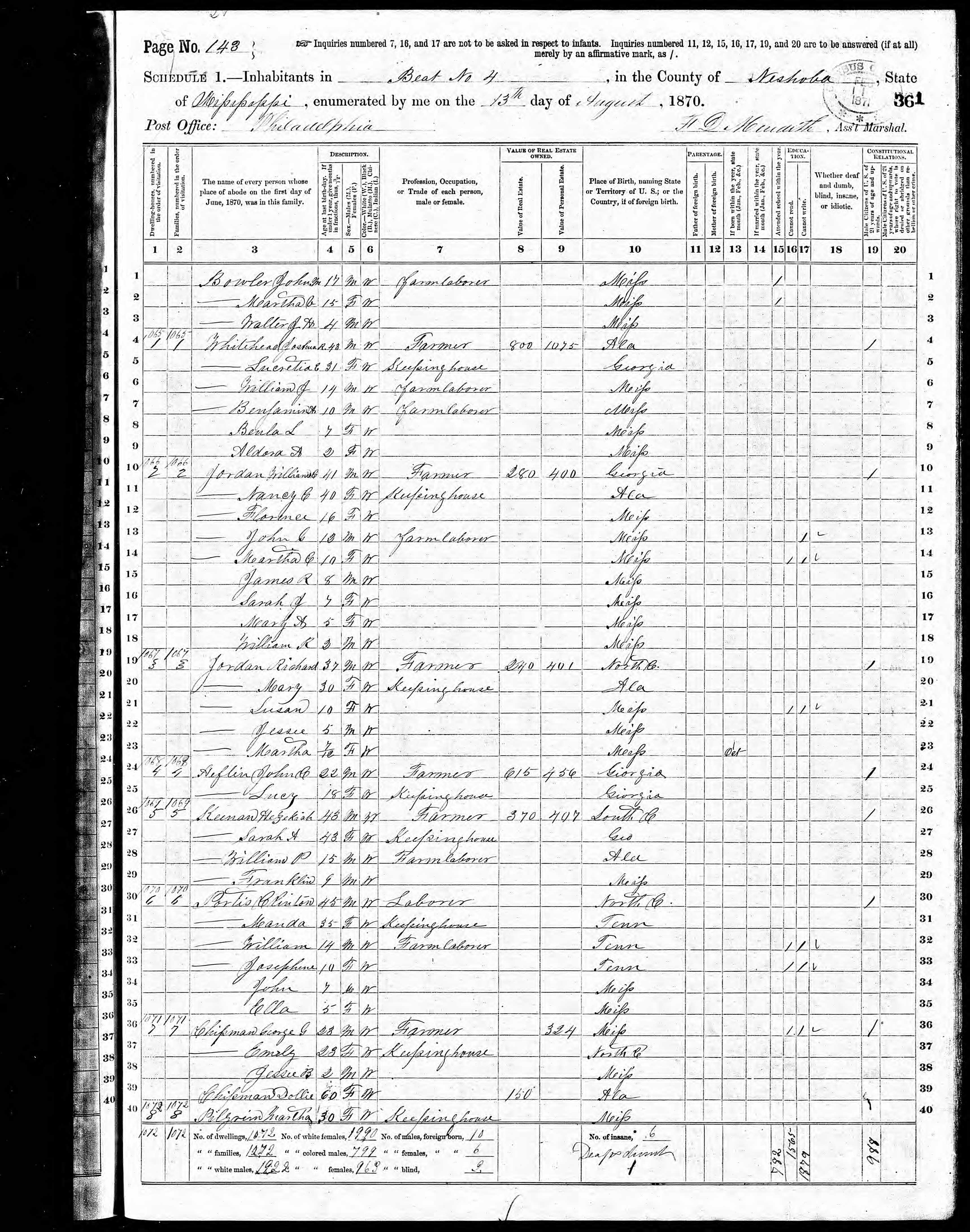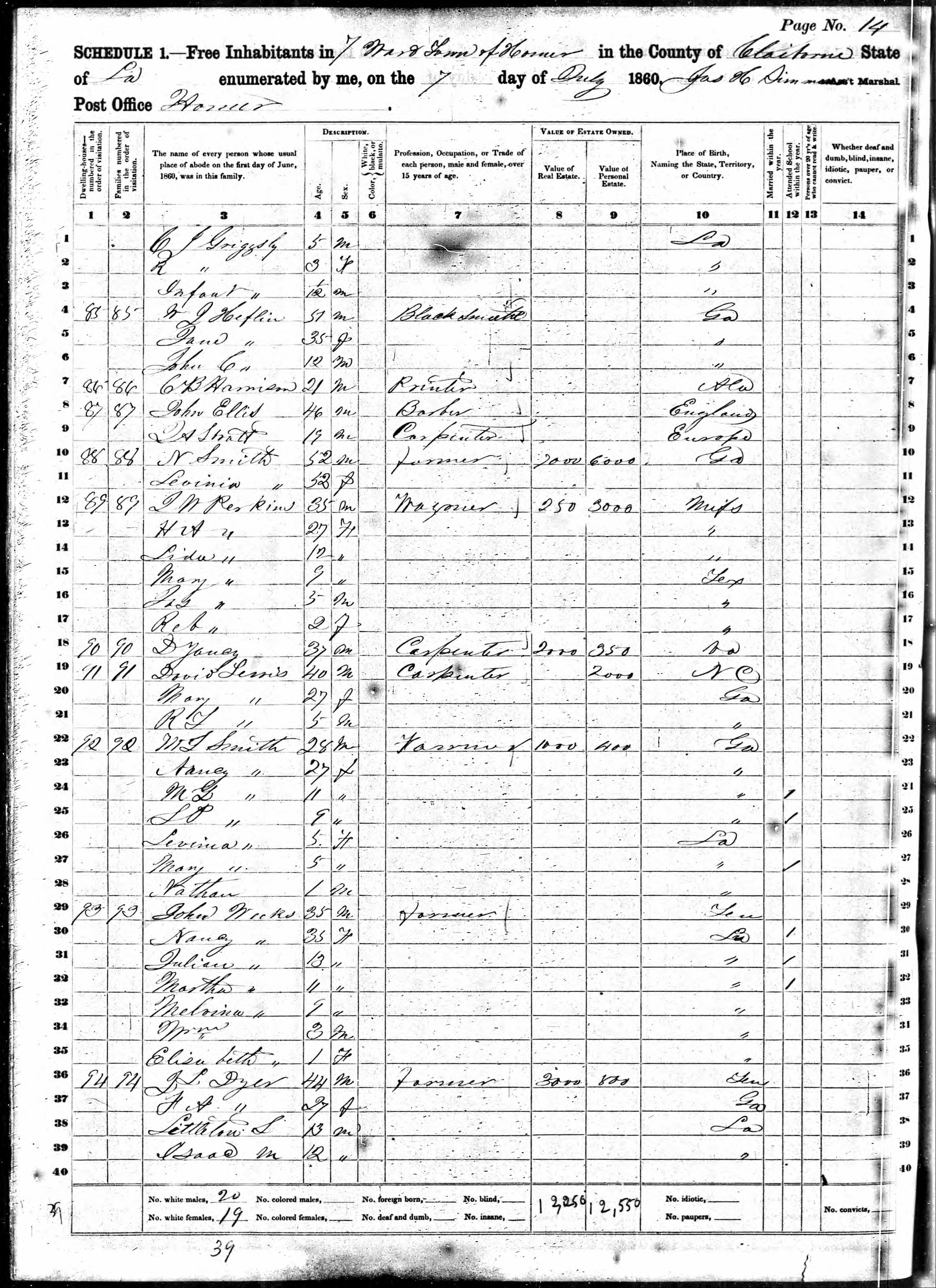 Residences1848 - Locust Grove, Henry, Georgia | 1850 - Henry, Georgia 1860 - Homer, Claiborne, Louisiana 1870 - Neshoba, Mississippi 1880 - Neshoba, Mississippi 1899 - Rock Branch, Newton, Mississippi |