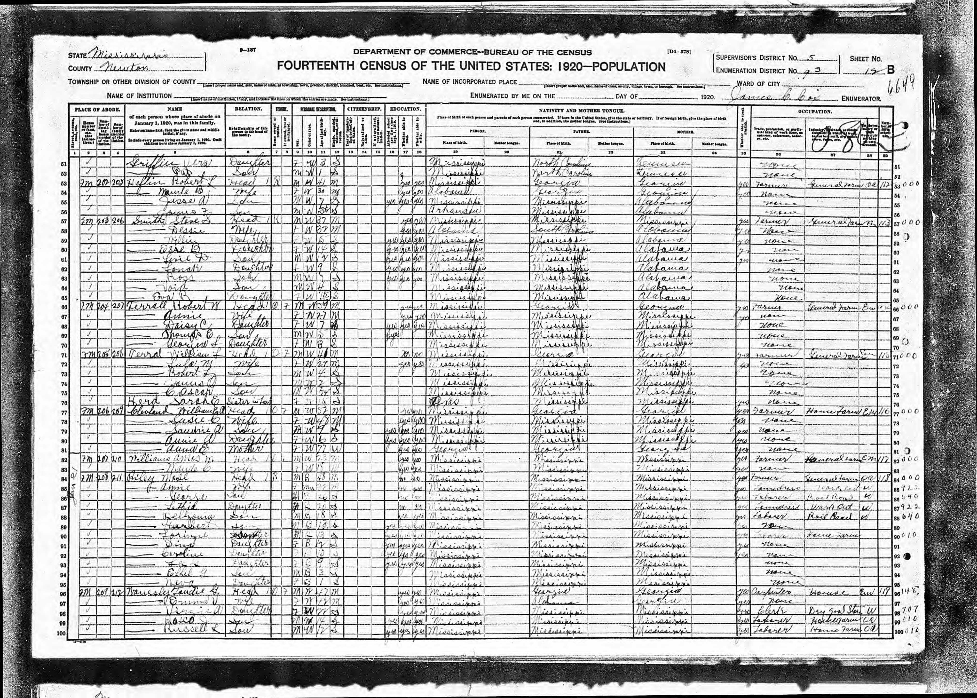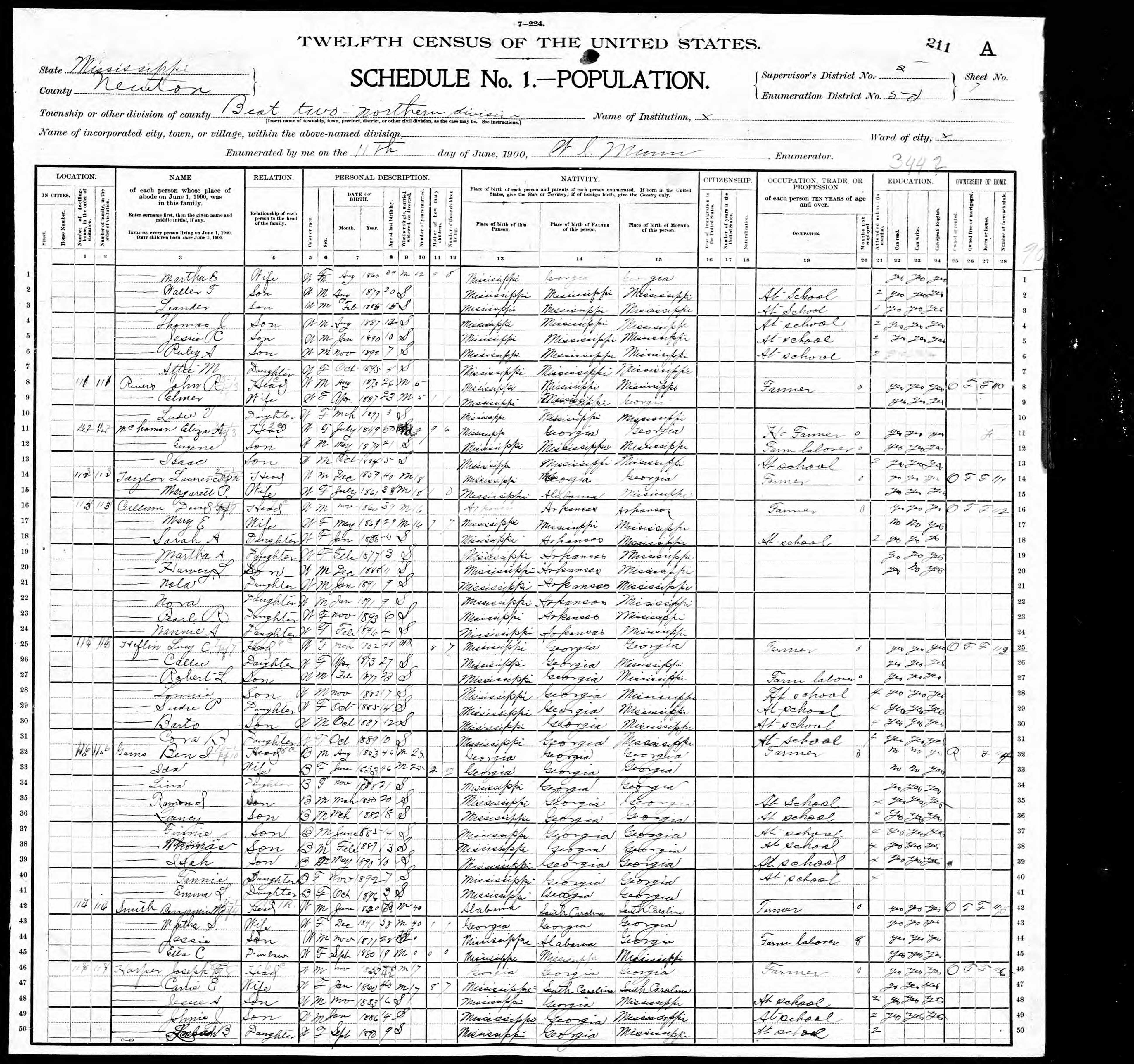 Residences1877 - Union, Newton, Mississippi | 1880 - Neshoba, Mississippi 1900 - Newton, Mississippi 1910 - Newton, Mississippi 1920 - Newton, Mississippi 1945 - Mobile, Mobile, Alabama |