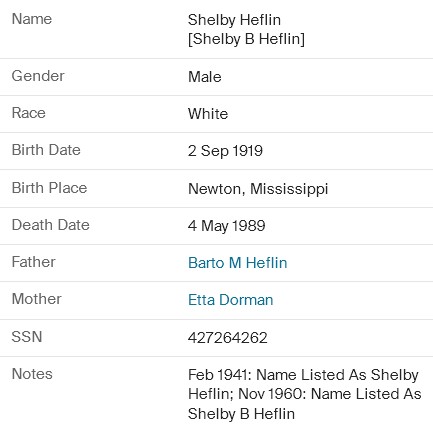 Residences1919 - Newton County, Mississippi | 1930 - Newton, Mississippi 1940 - Newton, Mississippi 1950 - Union, Newton, Mississippi 1989 - , Gulfport, Harrison, Mississippi, USA |
