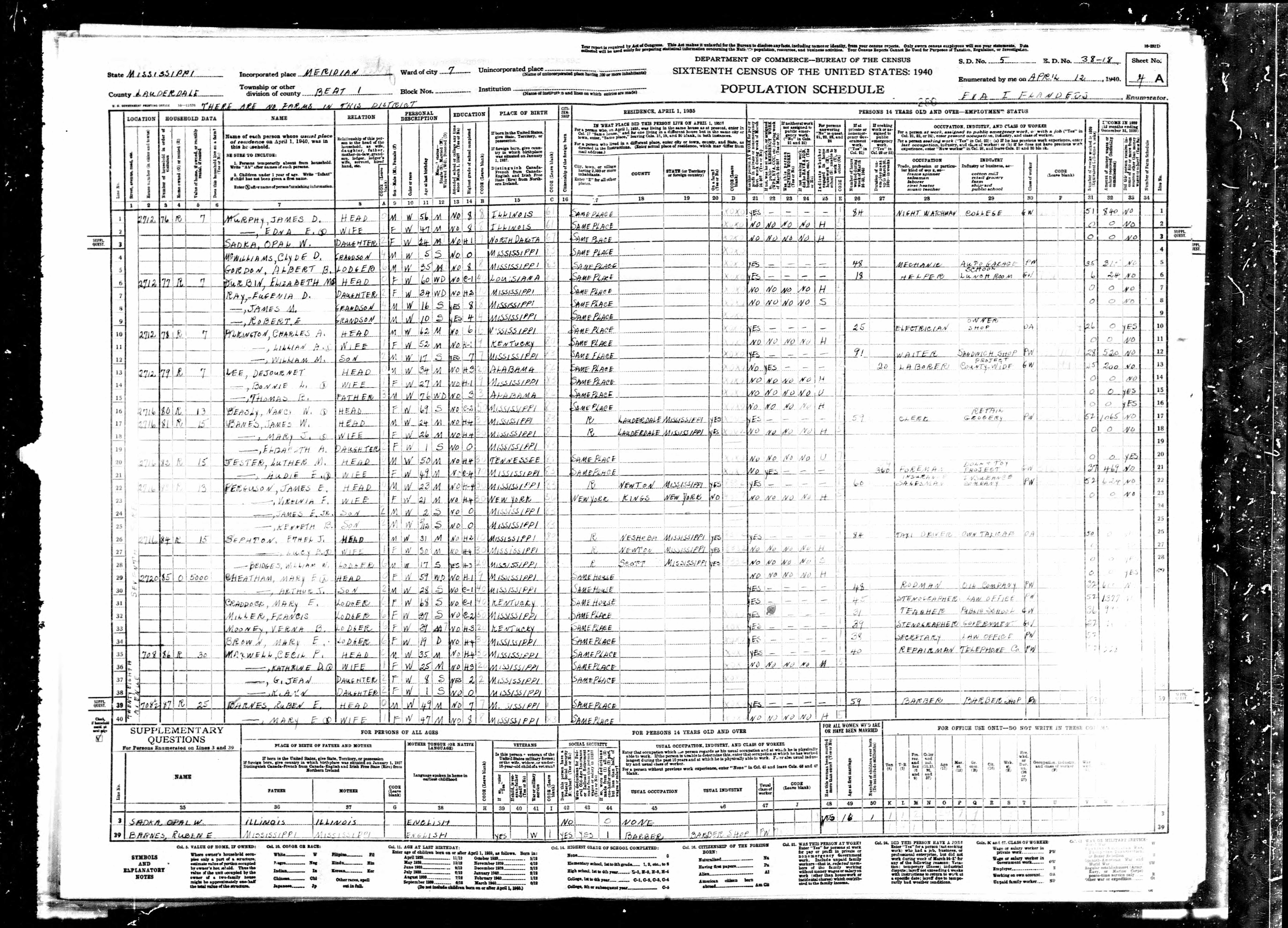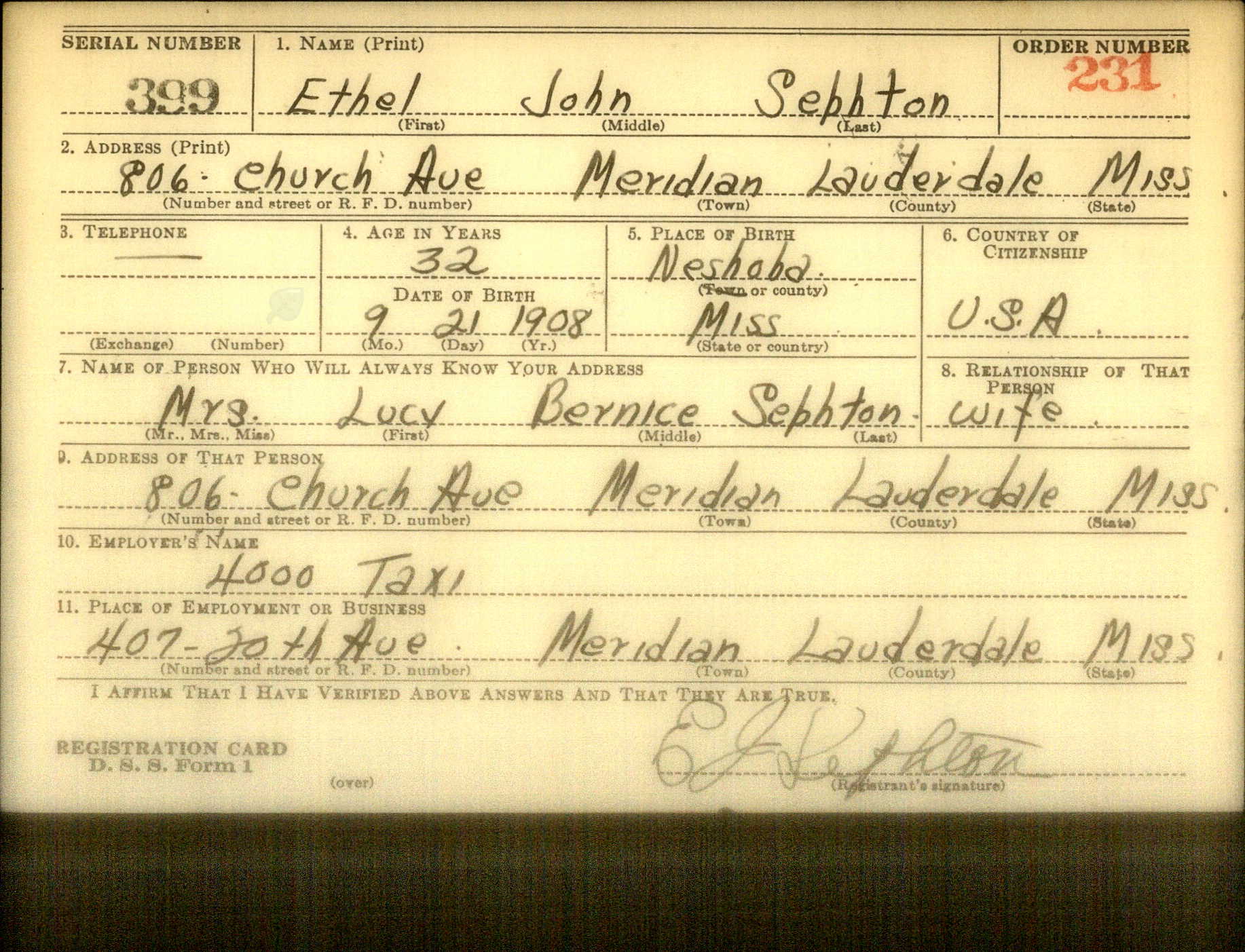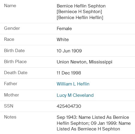 Residences1909 - Union, Newton, Mississippi | 1910 - Newton, Mississippi 1920 - Newton, Mississippi 1930 - Newton, Mississippi 1940 - Meridian, Lauderdale, Mississippi 1950 - Mobile, Mobile, Alabama 1998 - , Mobile, Mobile, Alabama, USA |