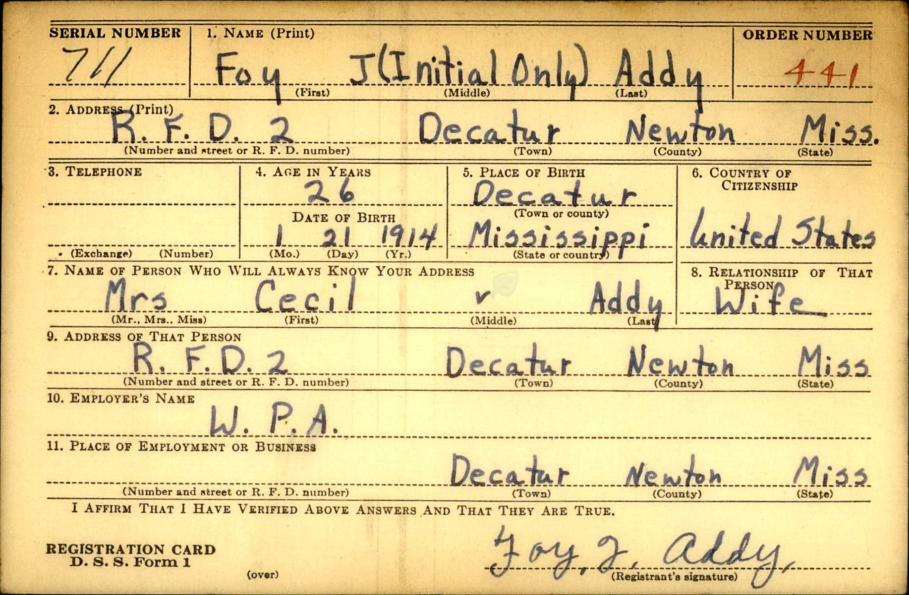 Residences1921 - Mississippi | 1930 - Newton, Mississippi 1940 - Newton, Mississippi 1950 - Washington, Mississippi 1994 - Decatur, Newton, Mississippi |