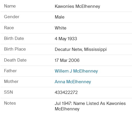 Residences1933 - Decatur, Newton, Mississippi | 1940 - Newton, Mississippi 1950 - Washington, Mississippi 2006 - , Belden, Lee, Mississippi |