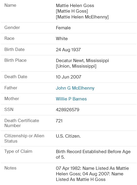 Mattie Helen McElhenney - Age (69y 9m 16d)