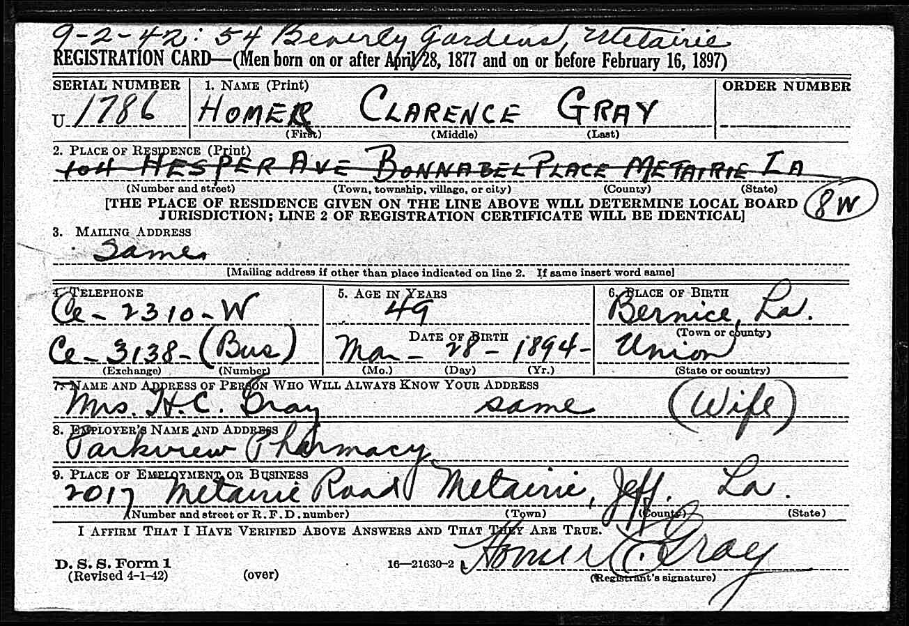 Residences1891 - Bernice, Union, Louisiana | 1900 - Union, Louisiana 1910 - Union, Louisiana 1920 - New Orleans, Orleans, Louisiana | 1930 - Jacksonville, Duval, Florida | 1940 - New Orleans, Orleans, Louisiana 1950 - Pass Christian, Harrison, Mississippi 1972 - , Pass Christian, Harrison, Mississippi, USA |