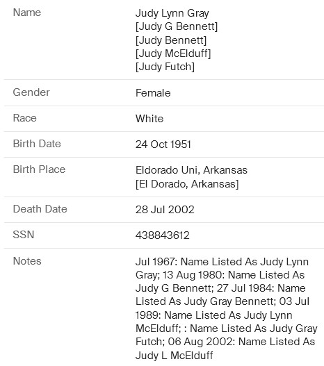 Judy Lynn Gray - Bennett - Billy James McElduff - Futch