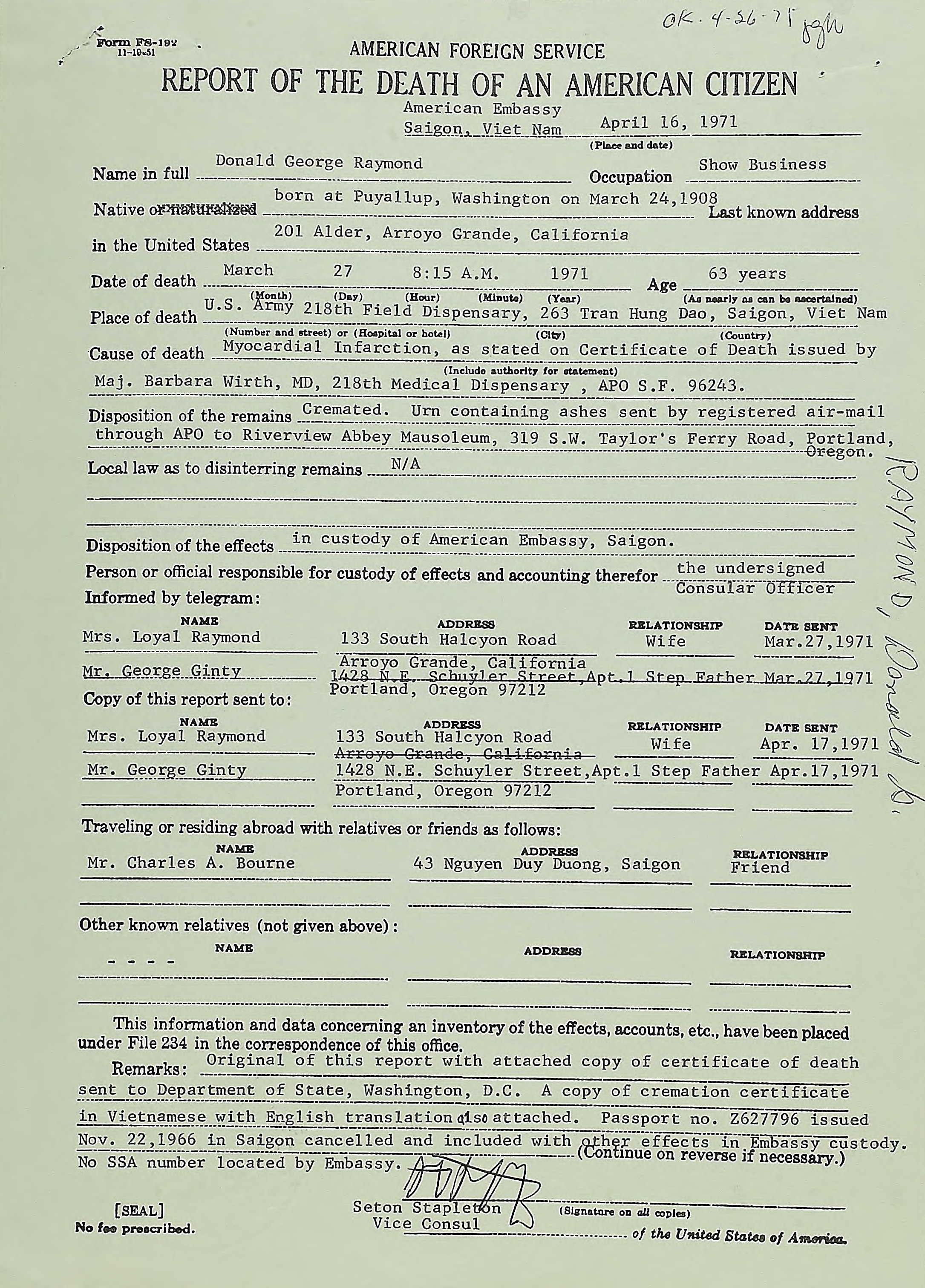 Residences1908 - Puyallup, Pierce, Washington | 1910 - Hoquiam, Chehalis, Washngton 1920 - Yacott, Clark, Washngton 1971 - Tran Hung Dao, Saigin, Vietnam |