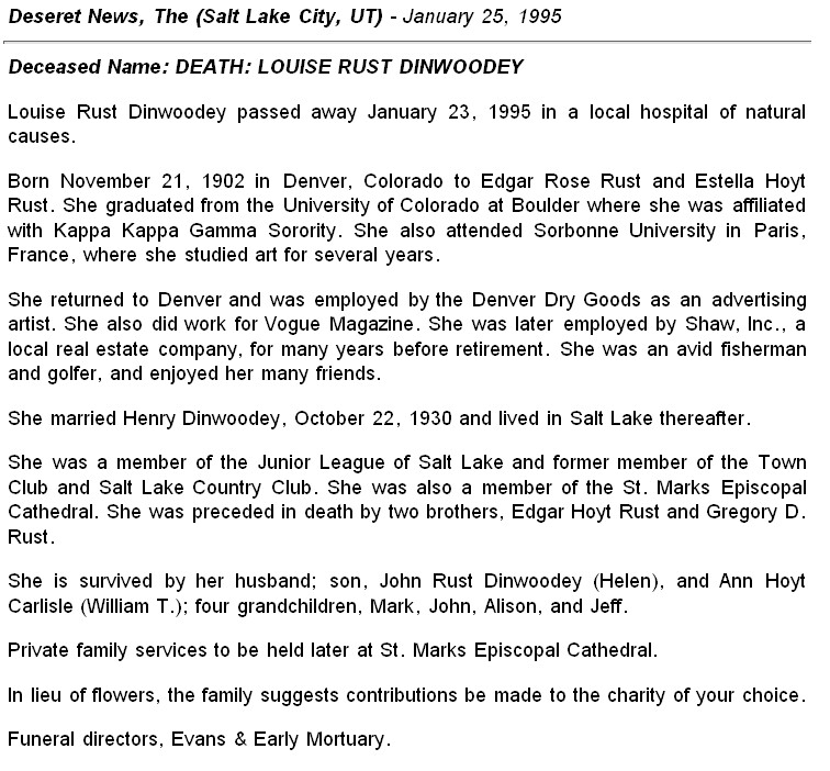 Residences1902 - Denver, Colorado | 1910 - Denver, Denver, Colorado 1920 - Boulder, Boulder, Colorado 1930 - Denver, Denver, Colorado 1995 - Salt Lake City, Salt Lake, Utah |