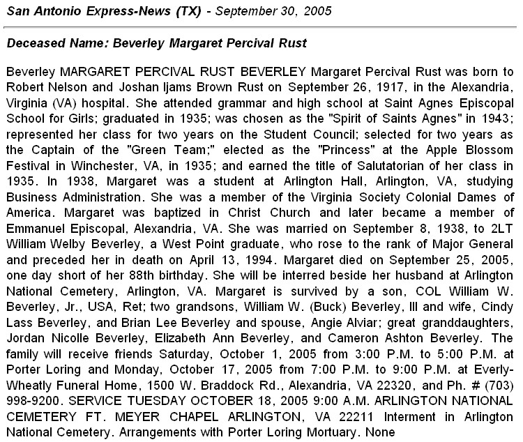 William was a 1938 graduate of West Point and rose to the rank of Major General in the Army.1917 - Alexandria, Virginia | 1920 - Jefferson, Alexandria, Virginia 1930 - Alexandria, Alexandria, Virginia 2005 - San Antonio, Bexar, Texas |