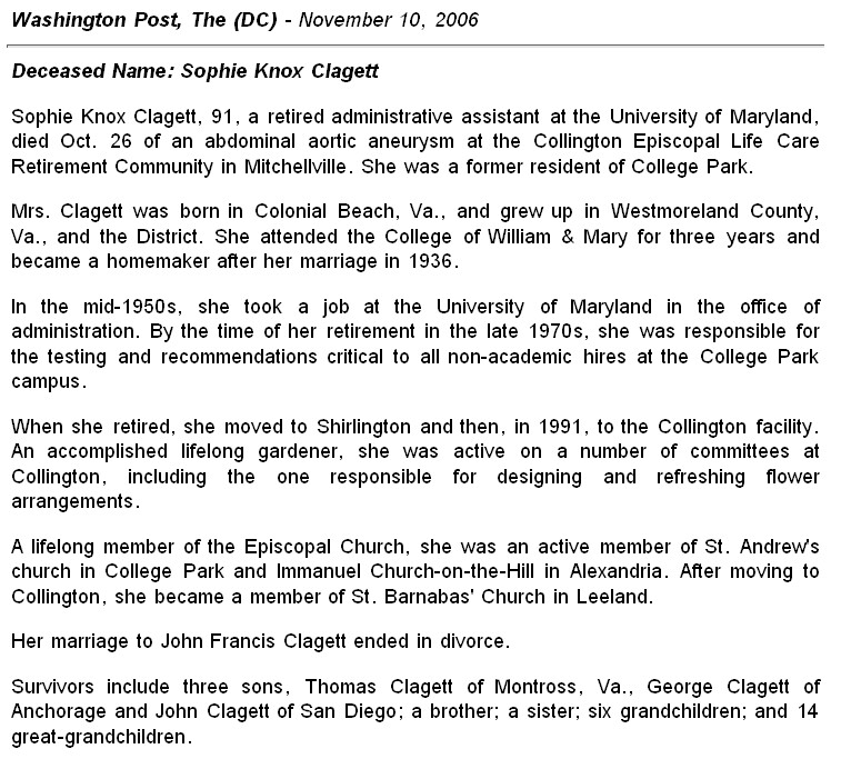 Residences1914 - Colonial Beach, Westmoreland, Virginia | 1920 - Arlington, Alexandria, Virginia 1930 - Edgewood, Allegheny, Pennsylvania 2006 - Bowie, Prince Georges, Maryland |