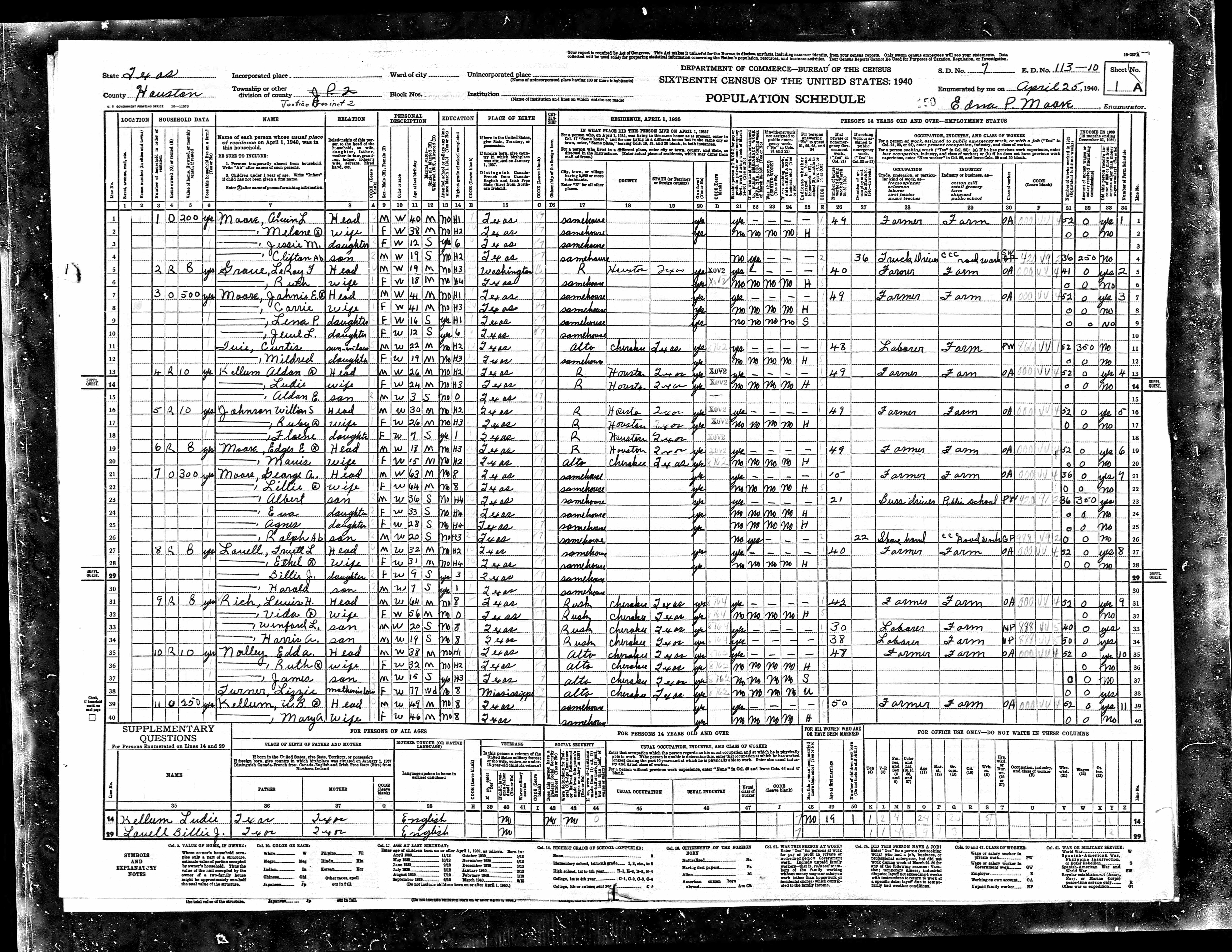Residences1901 - Texas | 1910 - Madison, Texas 1920 - Houston, Texas 1930 - Houston, Texas 1940 - Houston, Texas 1969 - Crockett, Texas |