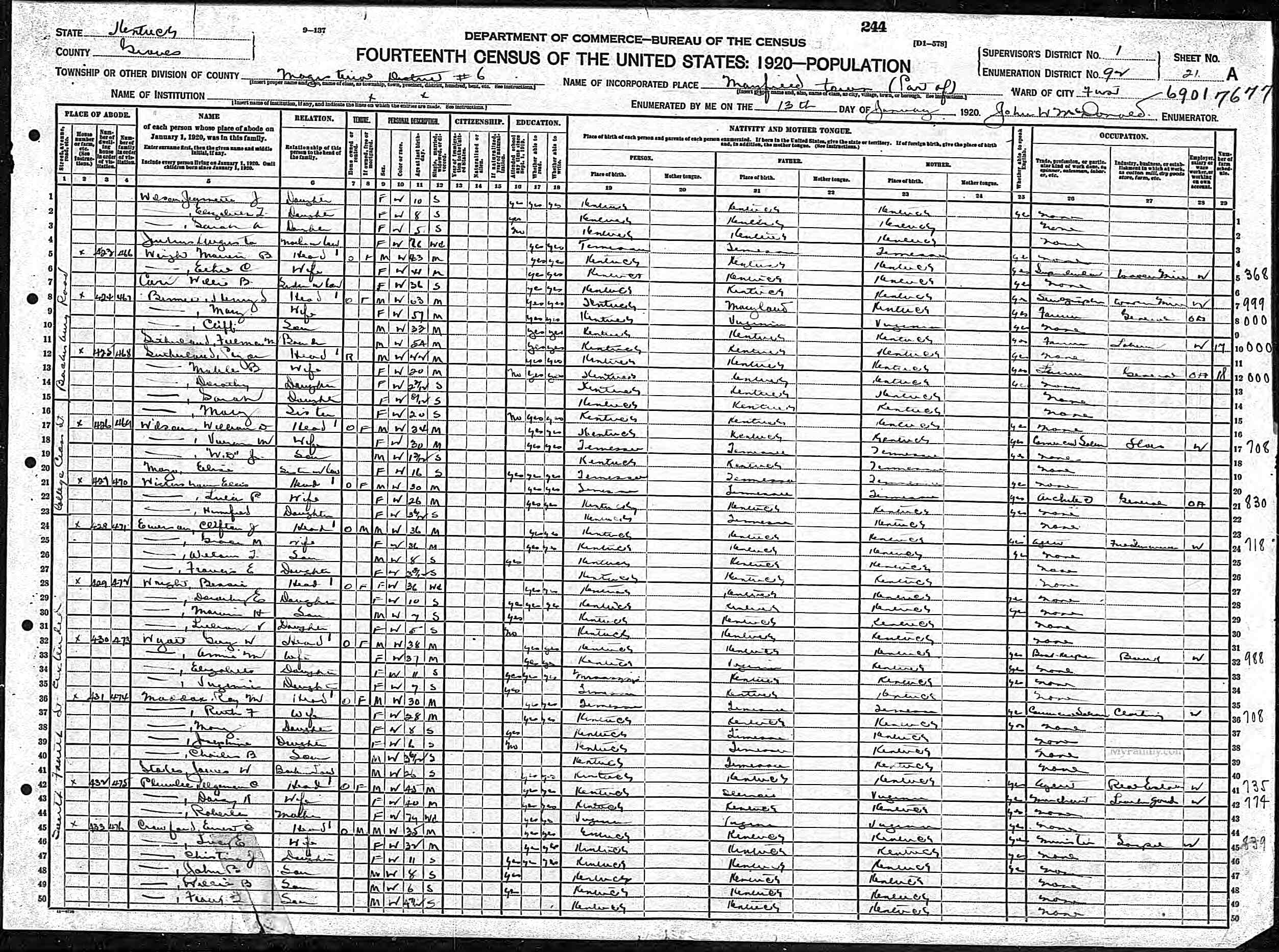 Residences1896 - Graves County, Kentucky | 1900 - Graves, Kentucky 1910 - Panther Creek, Graves, Kentucky 1920 - Mayfield, Graves, Kentucky 1930 - Mayfield, Graves, Kentucky 1969 - Mayfield, Graves, Kentucky |