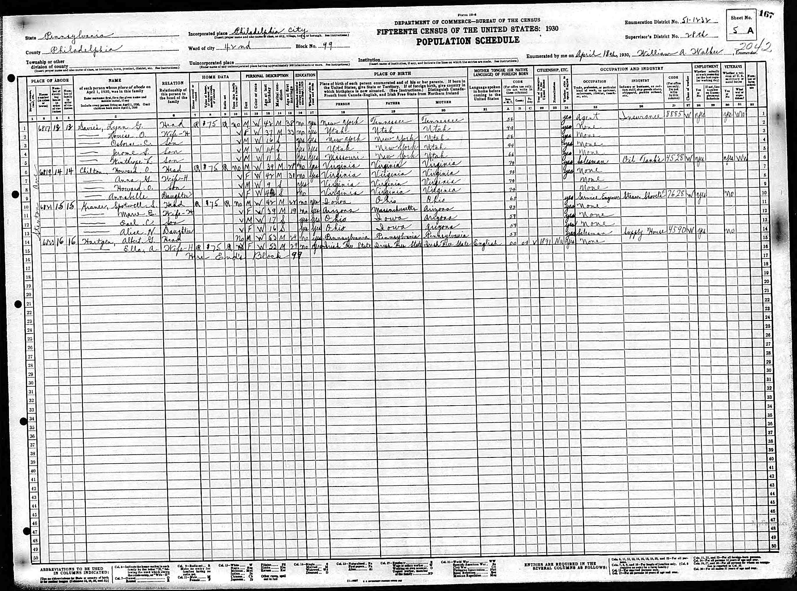Residences1890 - Bedford, Virginia | 1900 - Lisbon, Bedford, Virginia 1910 - Roanoke Highland, Roanoke, Virginia 1920 - Roanoke Jefferson, Roanoke, Virginia 1930 - Philadelphia, Philadelphia, Pennsylvania 1980 - Richmond, Henrico, Virginia |