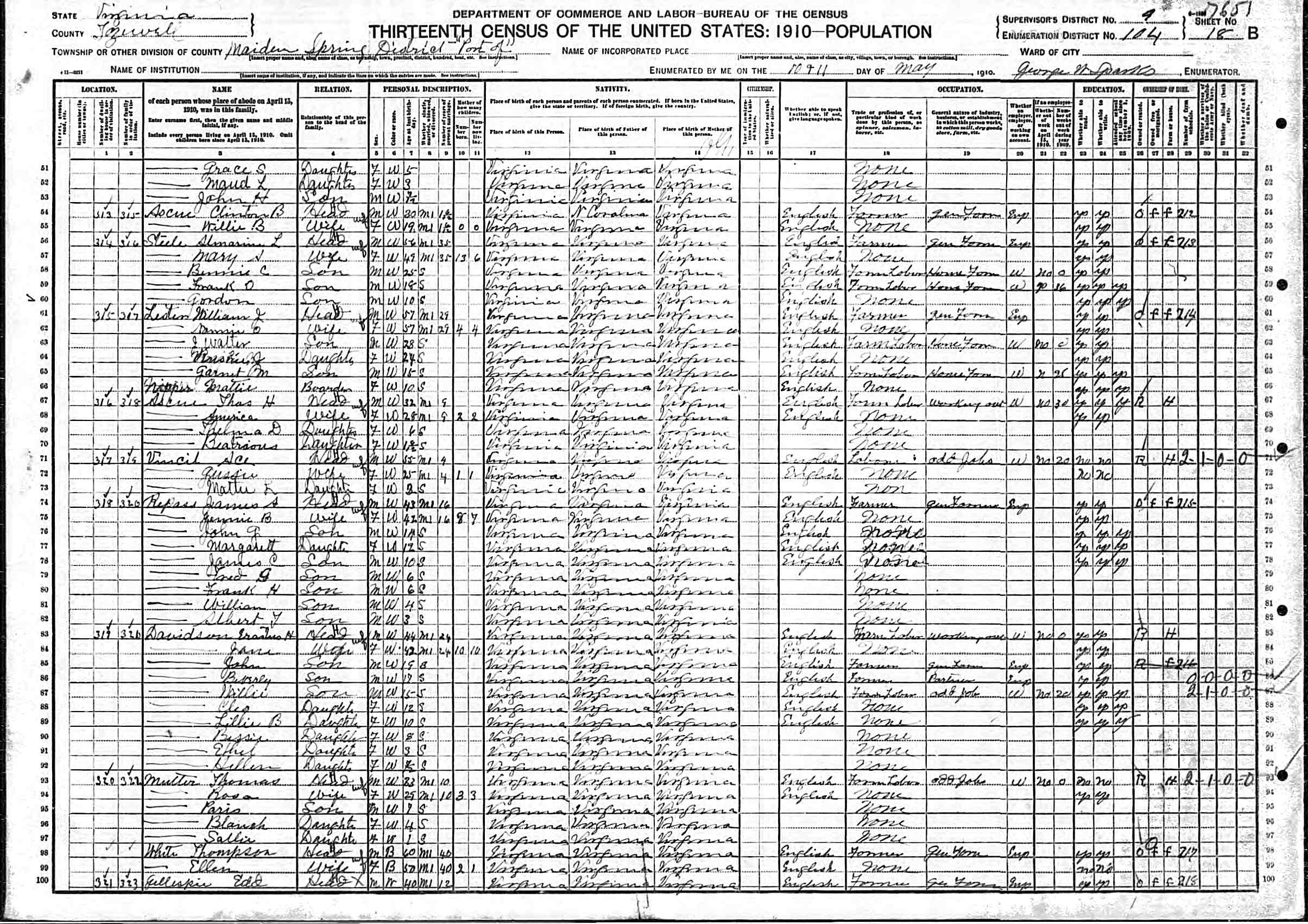 Residences1857 - Tazewell, Virginia | 1860 - Tazewell, Virginia 1870 - Jeffersonville, Tazewell, Virginia 1880 - Maiden Spring, Tazewell, Virginia | 1900 - Maiden Spring, Tazewell, Virginia | 1910 - Maiden Spring, Tazewell, Virginia 1920 - South River, Rockbridge, Virginia 1930 - Cedarville, Warren, Virginia |