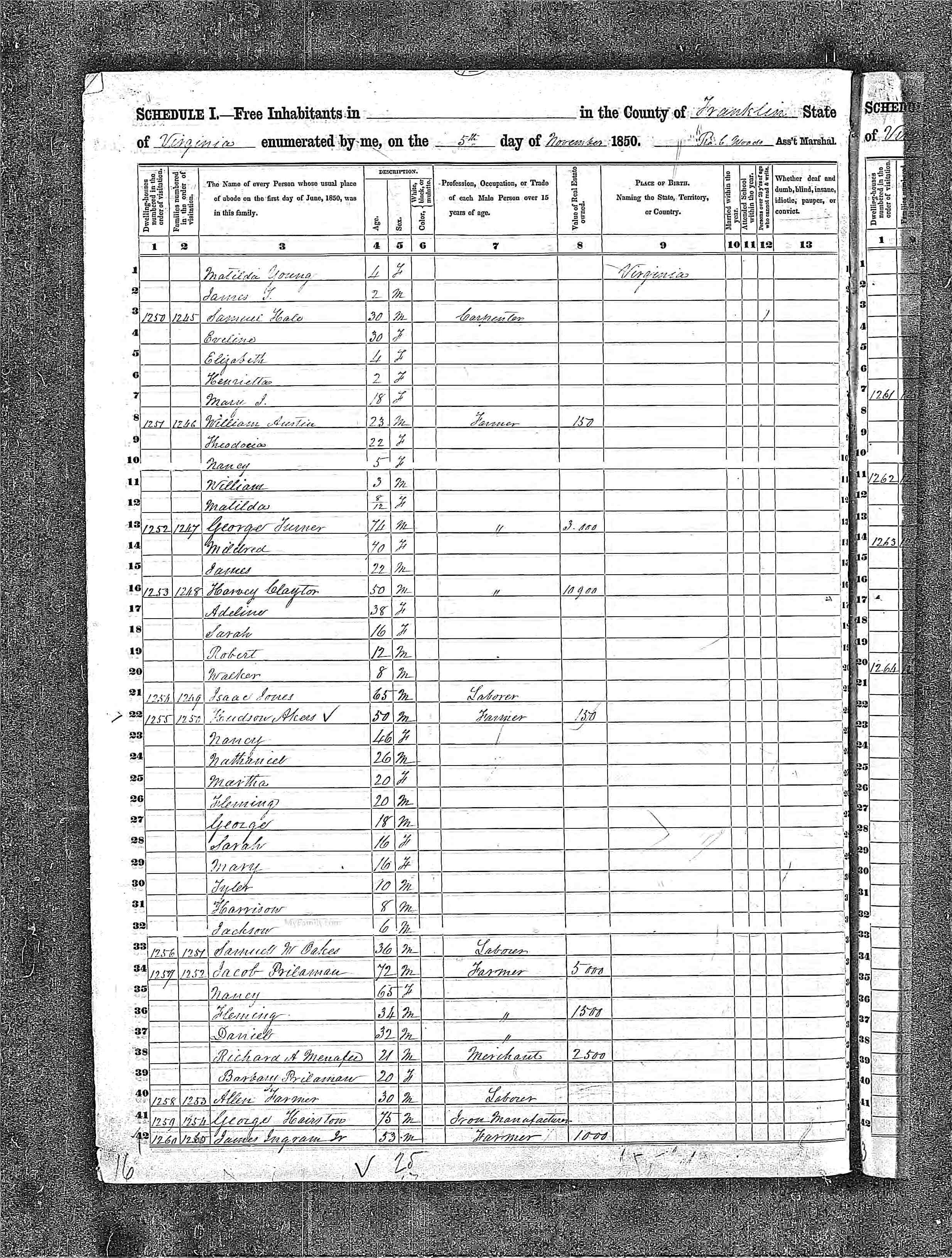 Residences1842 - Franklin, Virginia | 1850 - Franklin, Virginia 1860 - Franklin, Virginia 1910 - Roanoke Kimball, Roanoke, Virginia 1920 - Big Lick, Roanoke, Virginia 1925 - Roanoke, Virginia |
