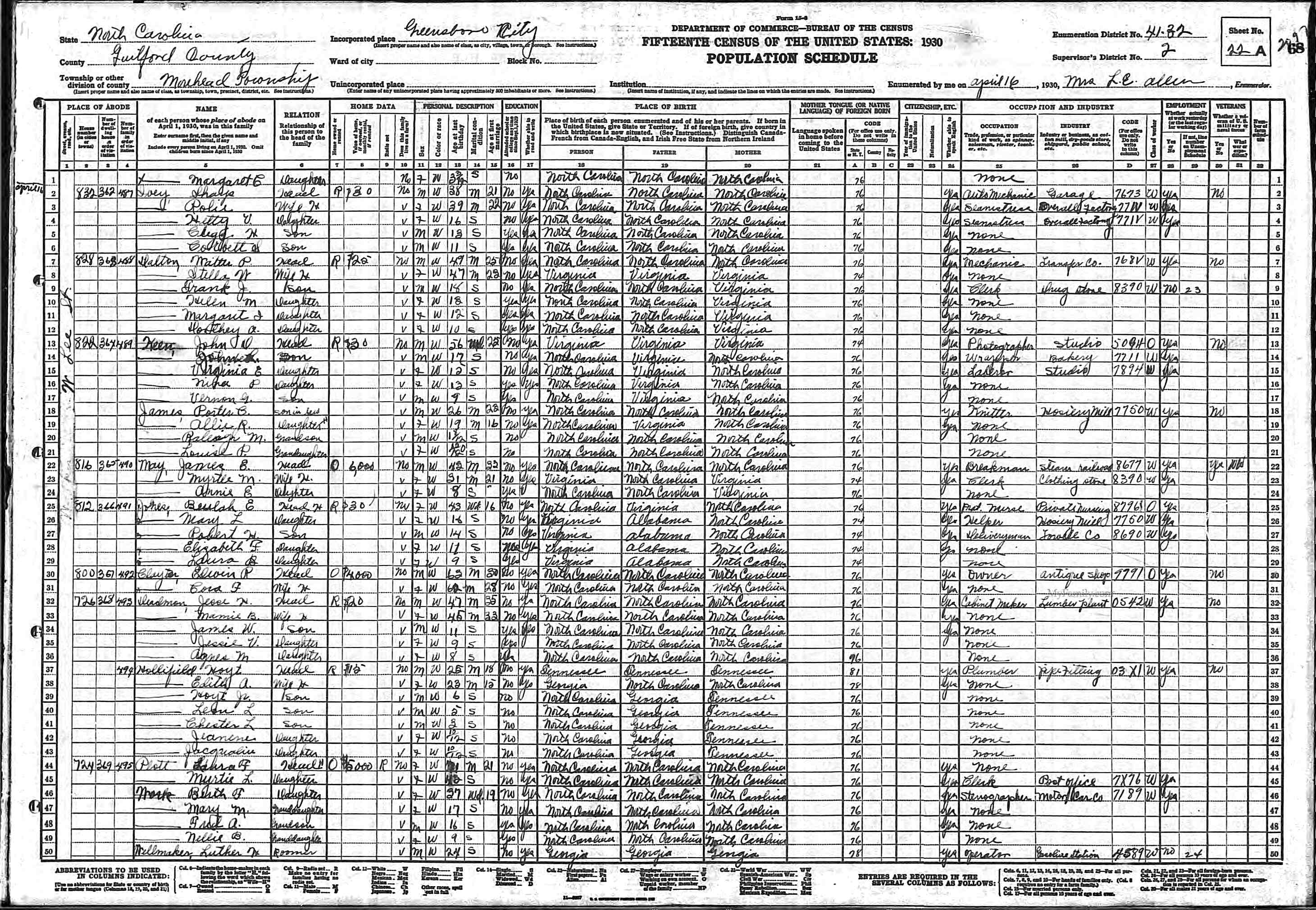 Residences1865 - Orange, North Carolina | 1870 - Durham, Orange, North Carolina 1880 - Chapel Hill, Orange, North Carolina 1900 - Durham, Durham, North Carolina | 1910 - Greensboro, Guilford, North Carolina | 1920 - Greensboro, Guilford, North Carolina 1930 - Greensboro, Guilford, North Carolina 1948 - Greensboro, North Carolina |