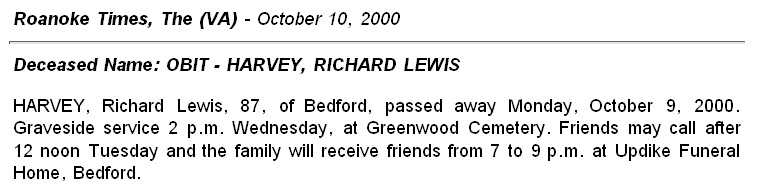 Residences1913 - Halifax, Virginia | 1920 - Staunton, Halifax, Virginia 1930 - Seneca, Campbell, Virginia 2000 - Bedford, Bedford City, Virginia |