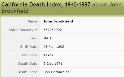 Residences1892 - Brownwood, Brown, Texas | 1900 - Brownwood, Brown, Texas 1920 - El Centro, Imperial, California 1971 - San Bernardino, San Bernardino, California |