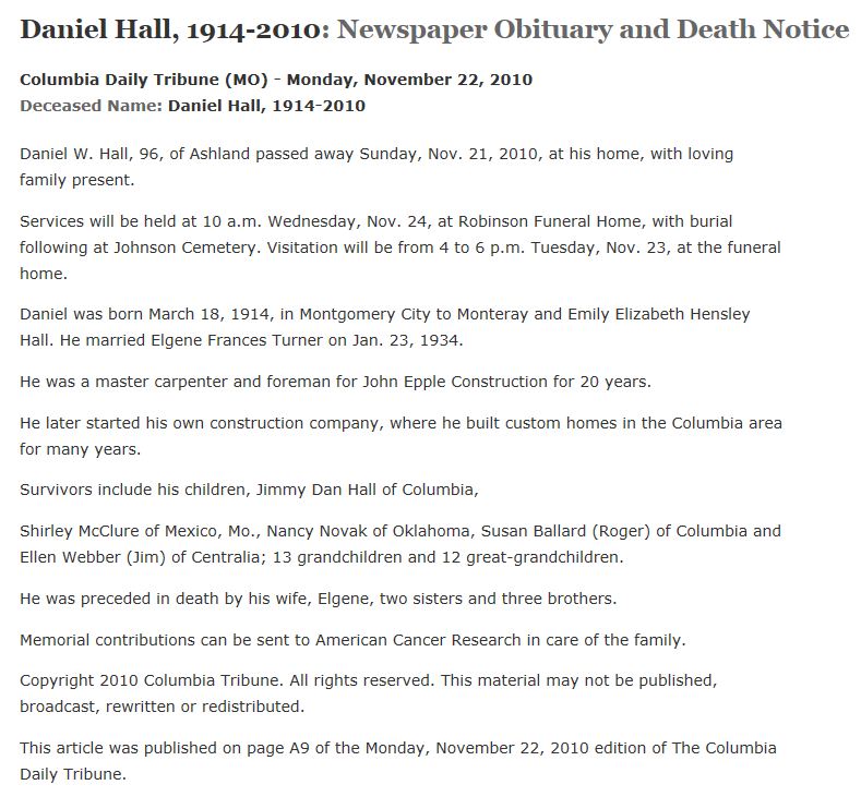 Residences1914 - Montgomery City, Missouri | 1920 - Montgomery, Montgomery, Missouri 1930 - Columbia, Boone, Missouri 1940 - Fugit, Decatur, Indiana 2010 - Ashland, Boone, Missouri |