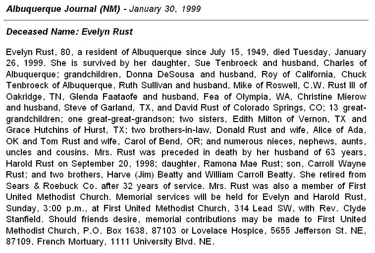 Residences1912 - Matador, Texas | 1920 - Jester, Greer, Oklahoma 1940 - Mangum, Greer, Oklahoma 1998 - Albuquerque, Bernalillo, New Mexico |