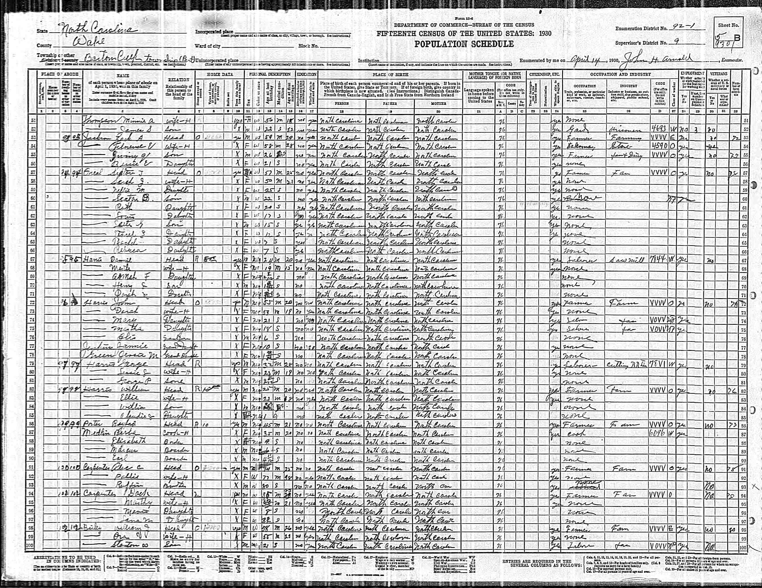 Residences1866 - North Carolina | 1870 - Bartons Creek, Wake, North Carolina 1900 - Barton Creek, Wake, North Carolina 1910 - Barton Creek, Wake, North Carolina 1920 - Bartons Creek, Wake, North Carolina 1930 - Bartons Creek, Wake, North Carolina |