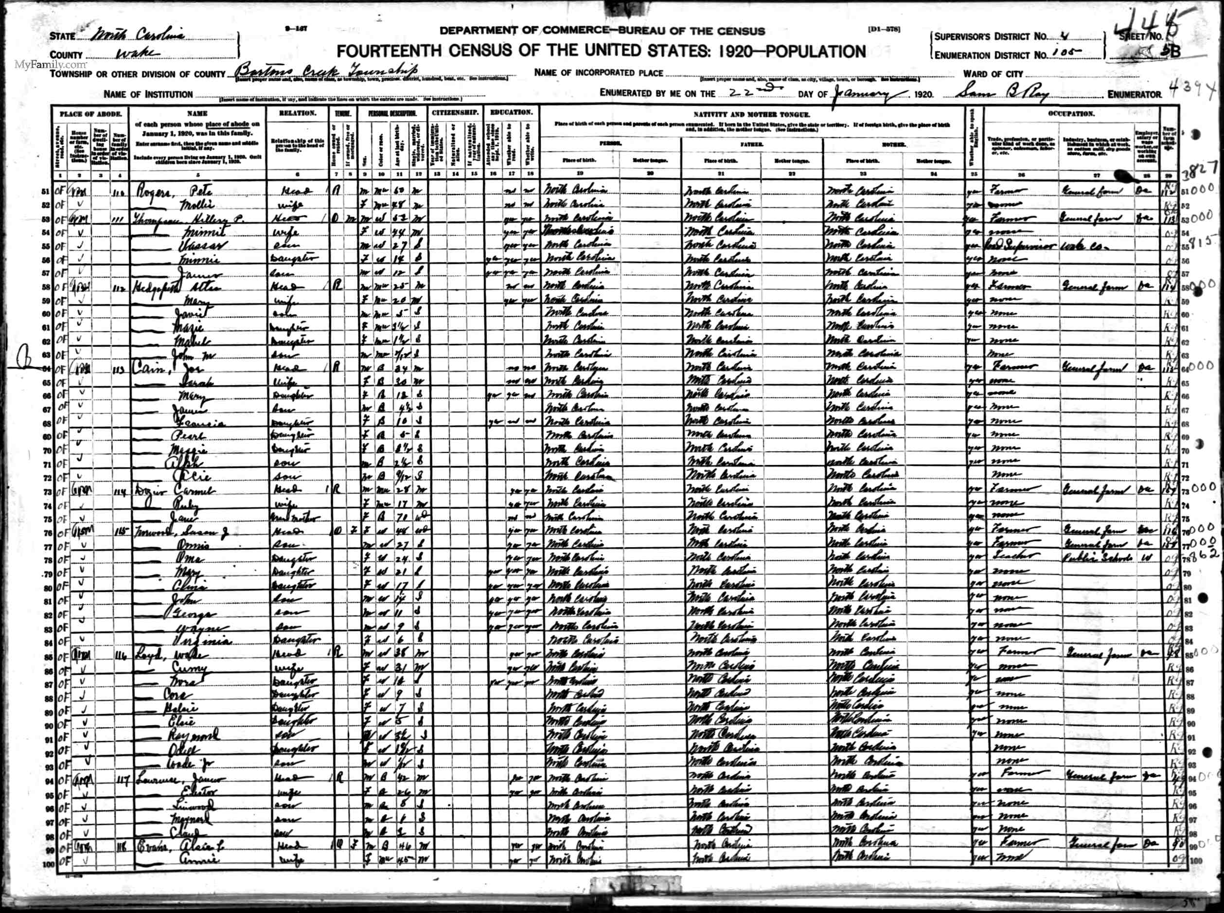 Residences1893 - Wake, North Carolina | 1900 - Barton Creek, Wake, North Carolina 1910 - Barton Creek, Wake, North Carolina 1920 - Bartons Creek, Wake, North Carolina 1960 - Raleigh, Wake, North Carolina |