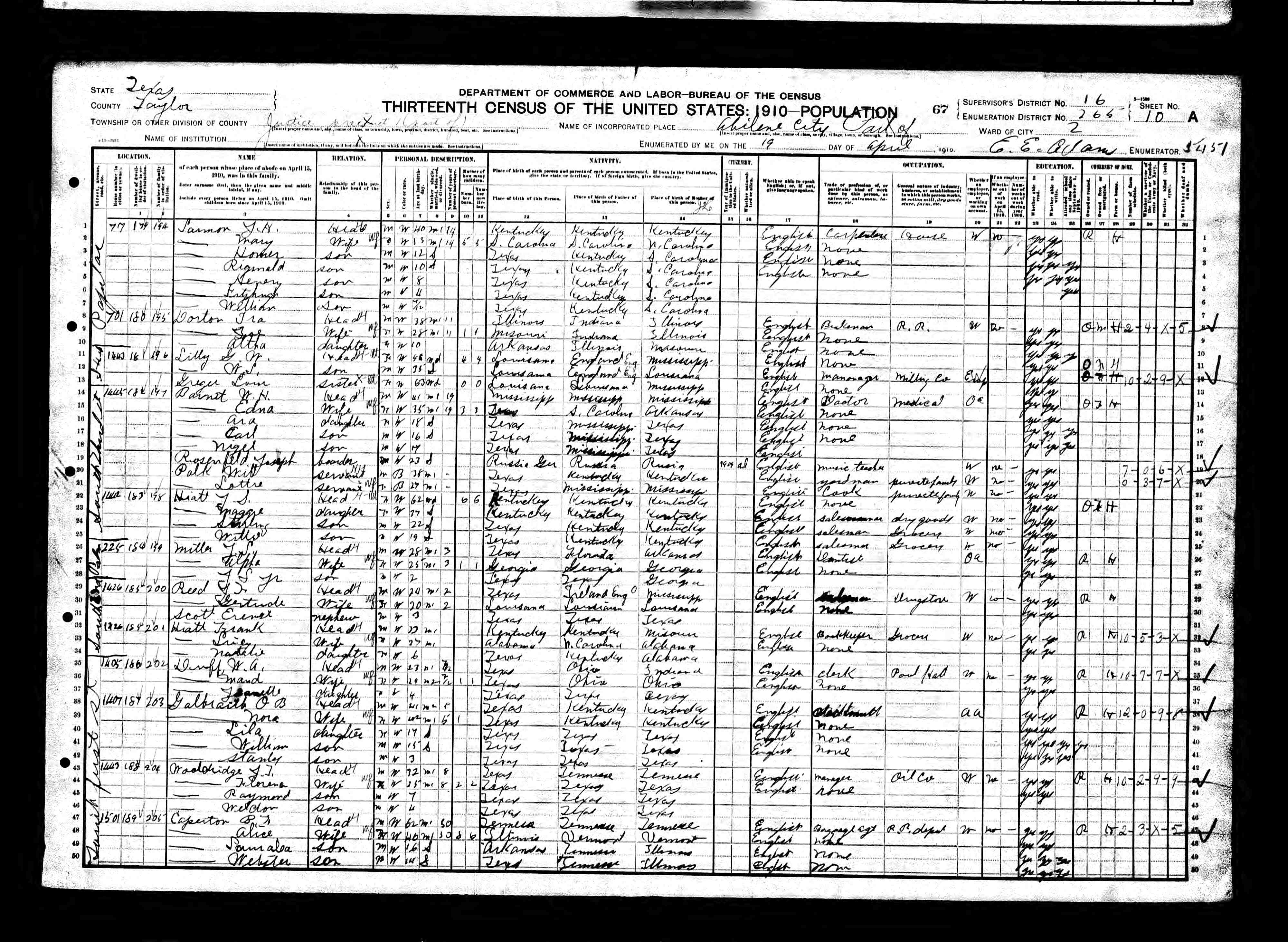 Residences1874 - Rusk County, Texas | 1880 - Overton, Rusk, Texas 1900 - Coleman, Texas 1910 - Abilene, Taylor, Texas 1920 - Abilene, Taylor, Texas 1930 - Abilene, Taylor, Texas 1954 - Abilene, Taylor, Texas |