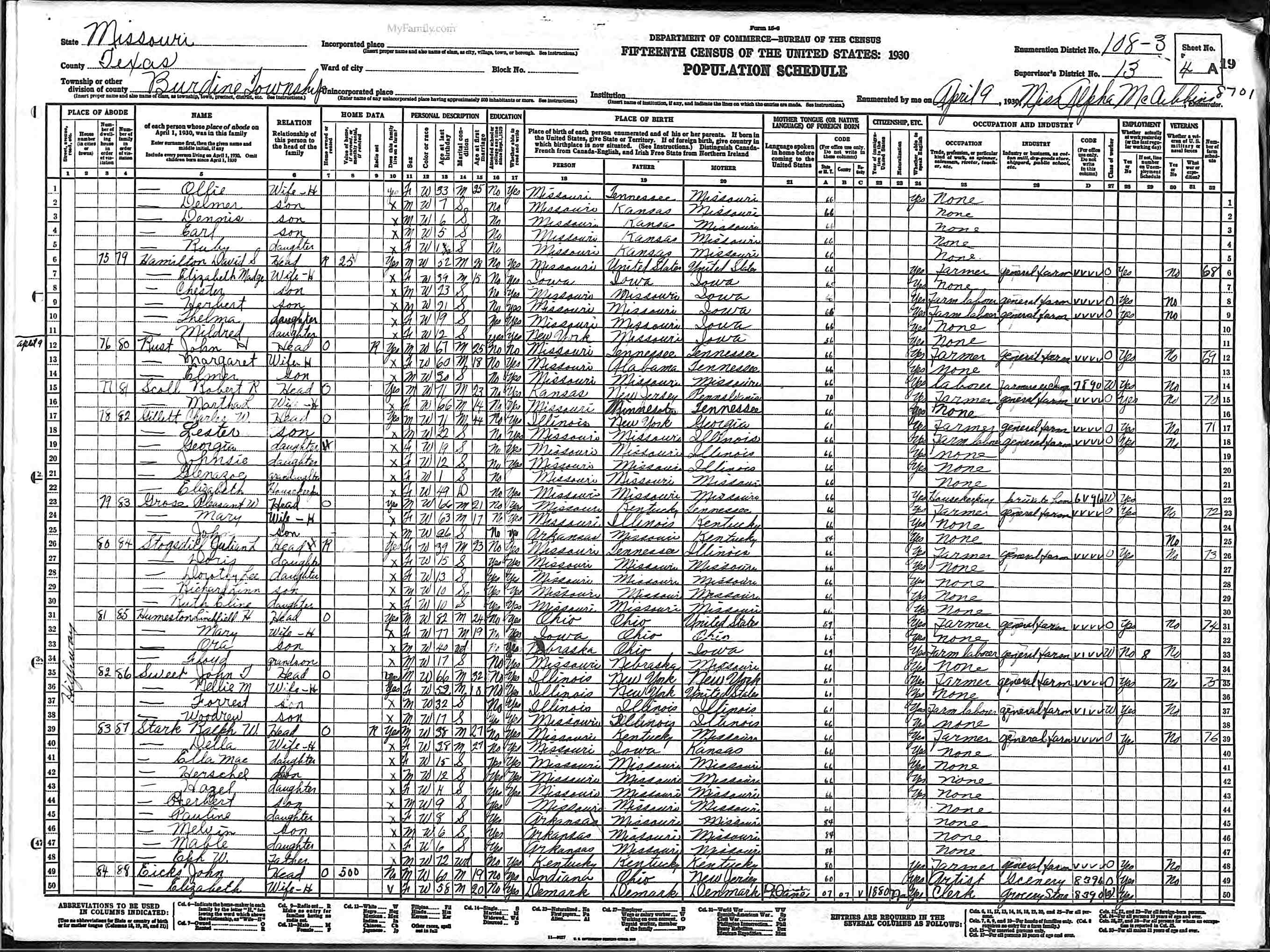 Residences1862 - Texas, Missouri | 1870 - Cass, Texas, Missouri 1880 - Rush, Buchanan, Missouri 1900 - Cass, Texas, Missouri | 1910 - Burdine, Texas, Missouri | 1920 - Burdine, Texas, Missouri 1930 - Burdine, Texas, Missouri 1938 - Missouri, Missouri |