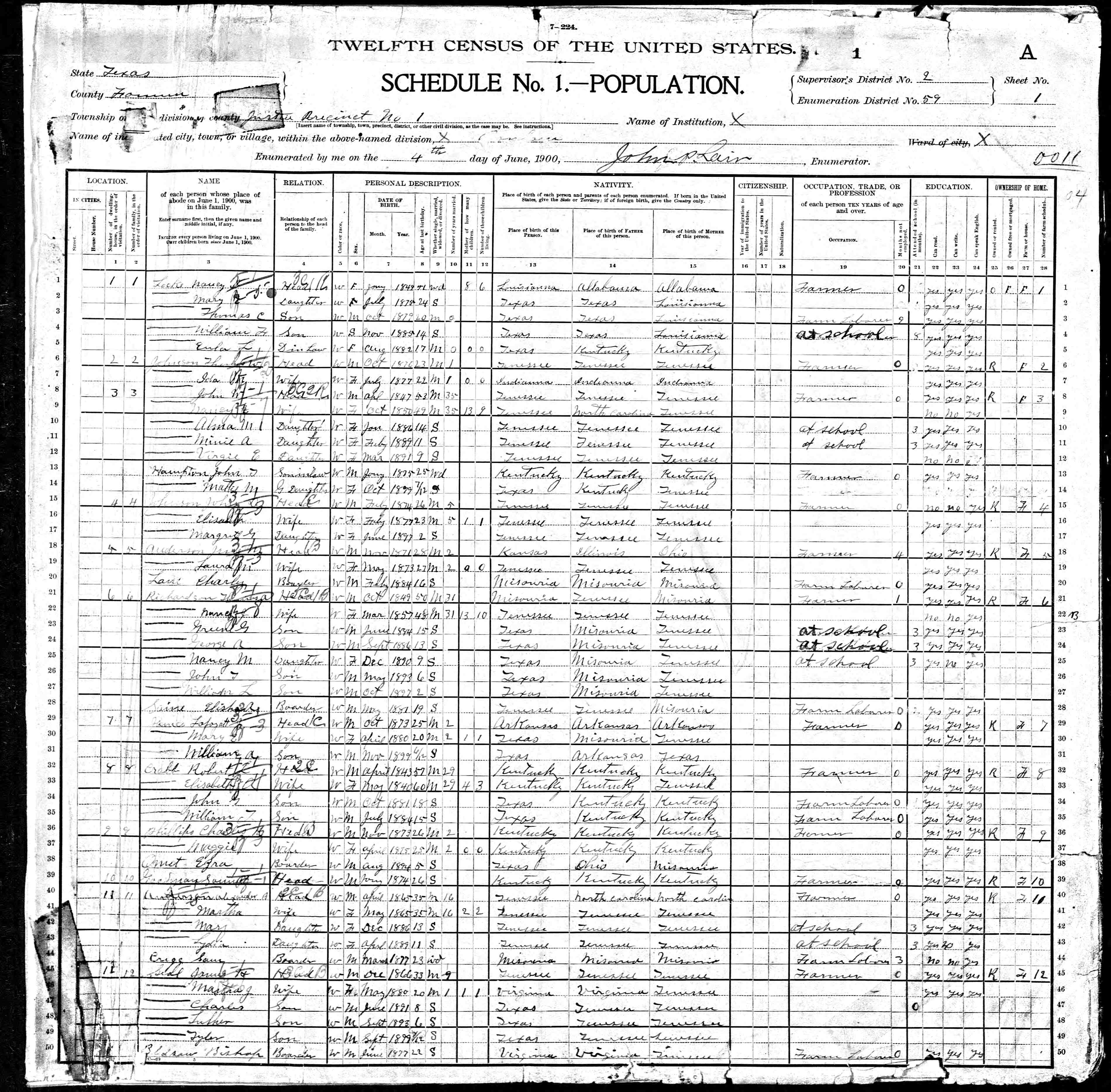 Residences1875 - Kentucky | 1880 - Rockfield, Warren, Kentucky 1900 - Fannin, Texas 1910 - Fannin, Texas 1920 - Bonham, Fannin, Texas 1930 - Bonham, Fannin, Texas 1957 - Bonham, Fannin, Texas |