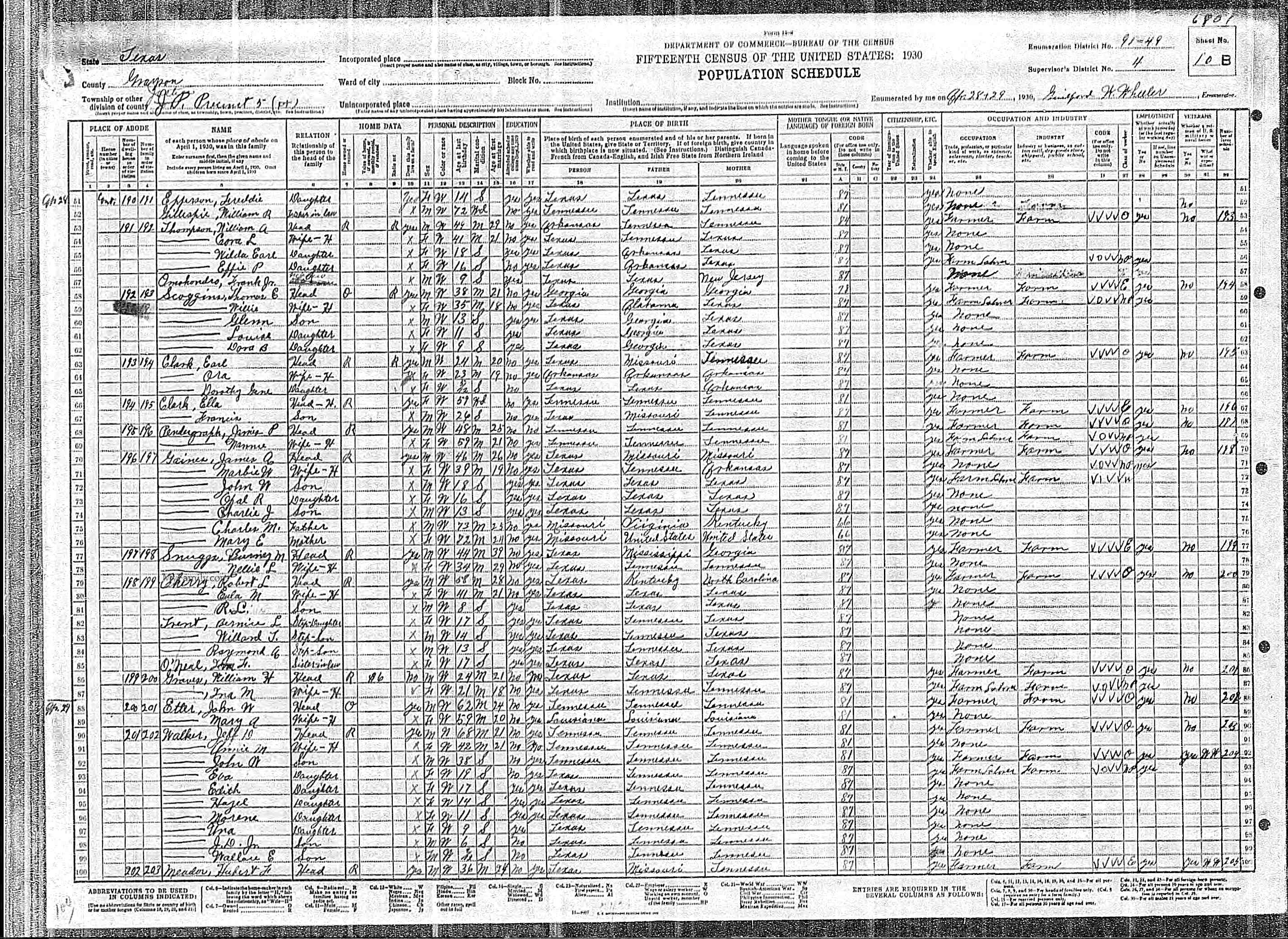 Residences1905 - Bloomfield, Texas | 1910 - Grayson, Texas 1920 - Grayson, Texas 1930 - Grayson, Texas 1990 - Tioga, Texas |