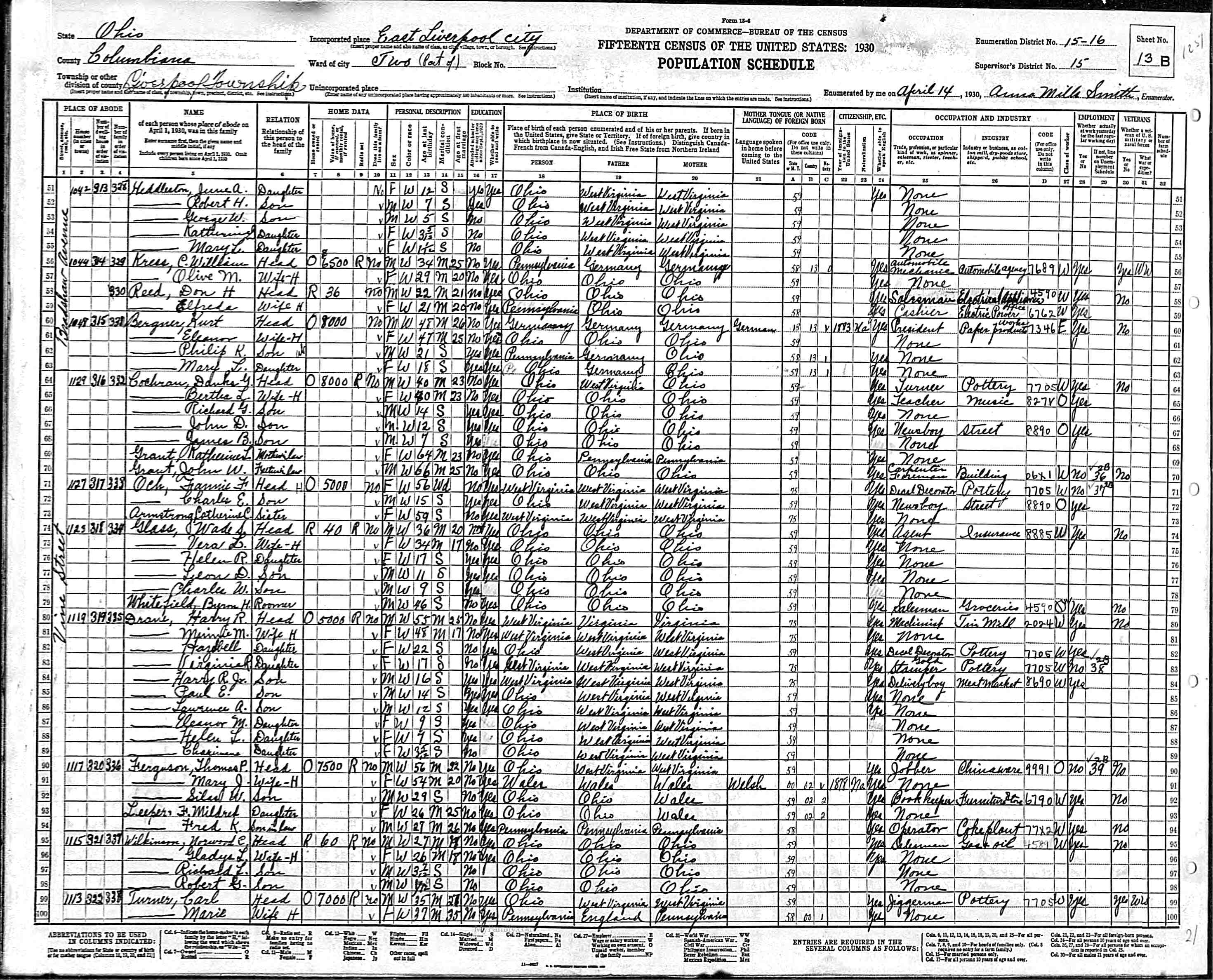 Residences1889 - Ohio | 1900 - East Liverpool, Columbiana, Ohio 1910 - East Liverpool, Columbiana, Ohio 1920 - East Liverpool, Columbiana, Ohio 1930 - East Liverpool, Columbiana, Ohio 1965 - Los Angeles, California |
