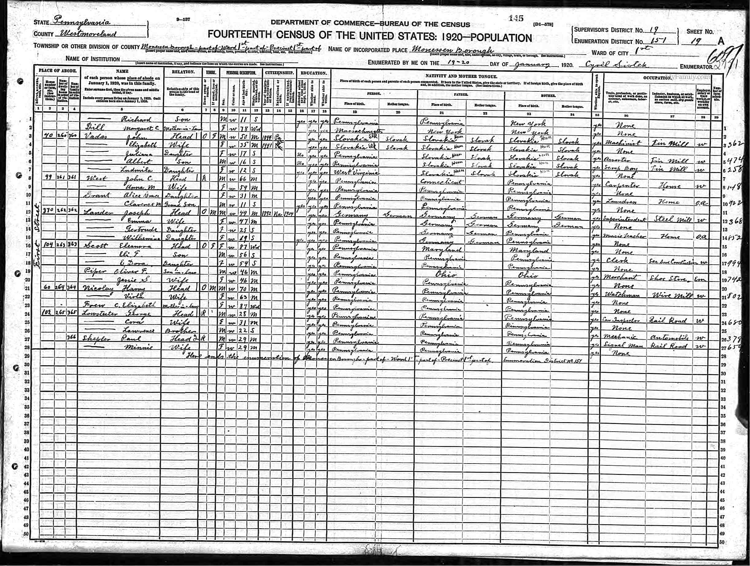 Residences1908 - Pennsylvania | 1910 - Monessen, Westmoreland, Pennsylvania 1920 - Monessen, Westmoreland, Pennsylvania 1981 - Charleroi, Washington, Pennsylvania |
