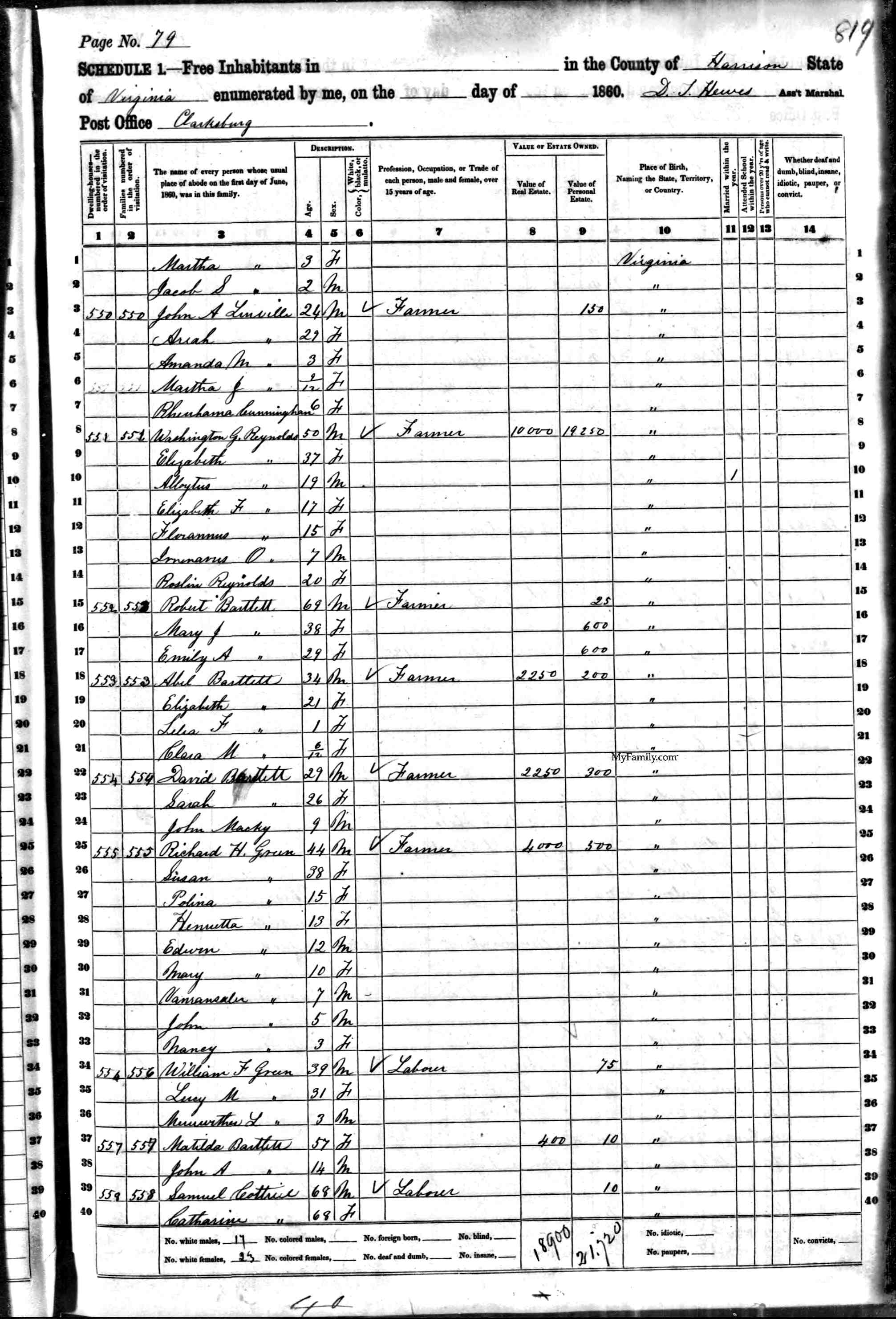 Residences1839 - Pennsylvania | 1850 - Marion, Virginia 1860 - Harrison, Virginia 1870 - Coal, Harrison, West Virginia 1880 - Coal, Harrison, West Virginia 1900 - Clark, Harrison, West Virginia 1910 - Clarksburg, Harrison, West Virginia |