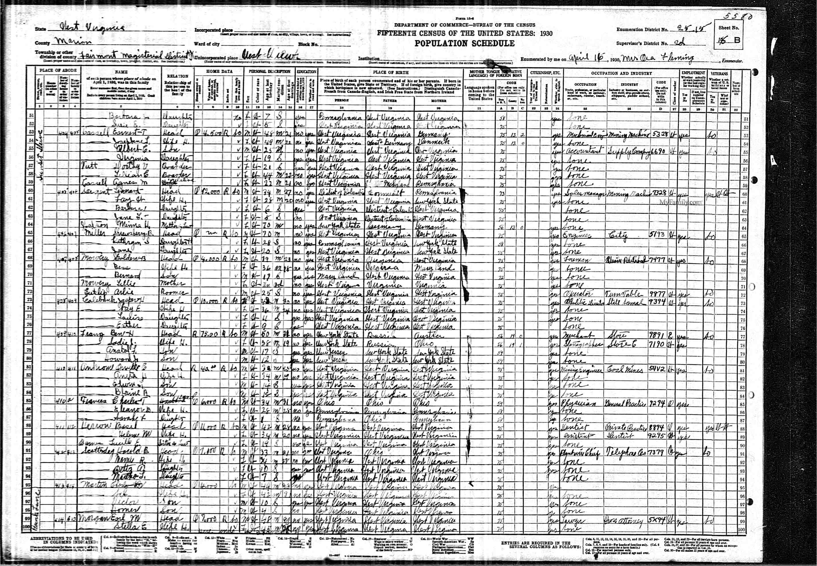 Residences1892 - Enterprise, Harrison, West Virginia | 1900 - Clay, Harrison, West Virginia 1910 - Clay, Harrison, West Virginia 1920 - Court House, Taylor, West Virginia 1930 - Fairmont, Marion, West Virginia 1940 - Clay, Harrison, West Virginia 1975 - Shinnston, Harrison, West Virginia |