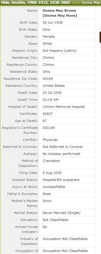 Residences1938 - Millville, Ohio | 1940 - Ross, Butler, Ohio 2005 - Sabina, Clinton, Ohio |