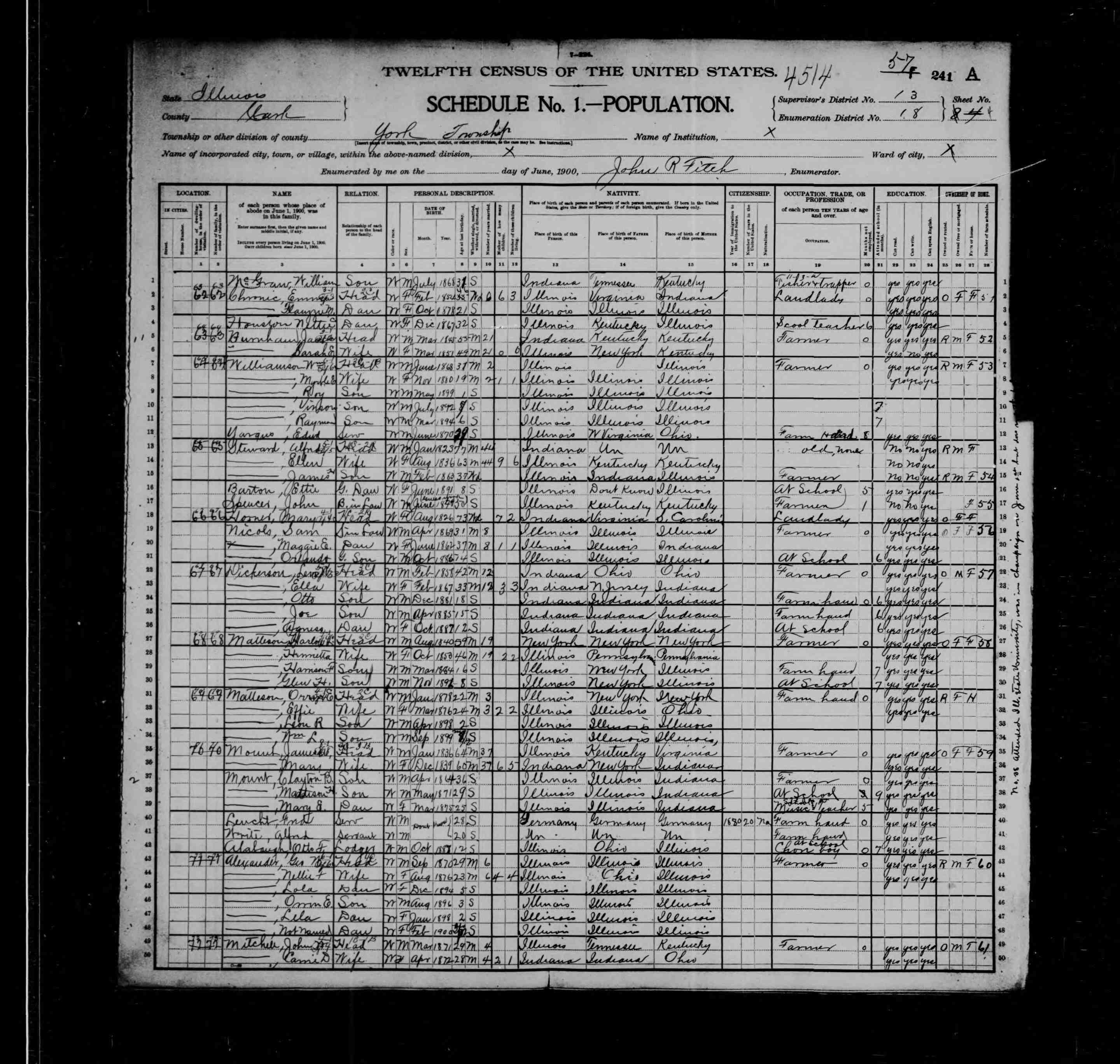 Residences1876 - Melrose, Illinois | 1880 - Melrose, Clark, Illinois 1900 - York, Clark, Illinois 1910 - Melrose, Clark, Illinois 1920 - Paris, Edgar, Illinois 1930 - Paris, Edgar, Illinois |