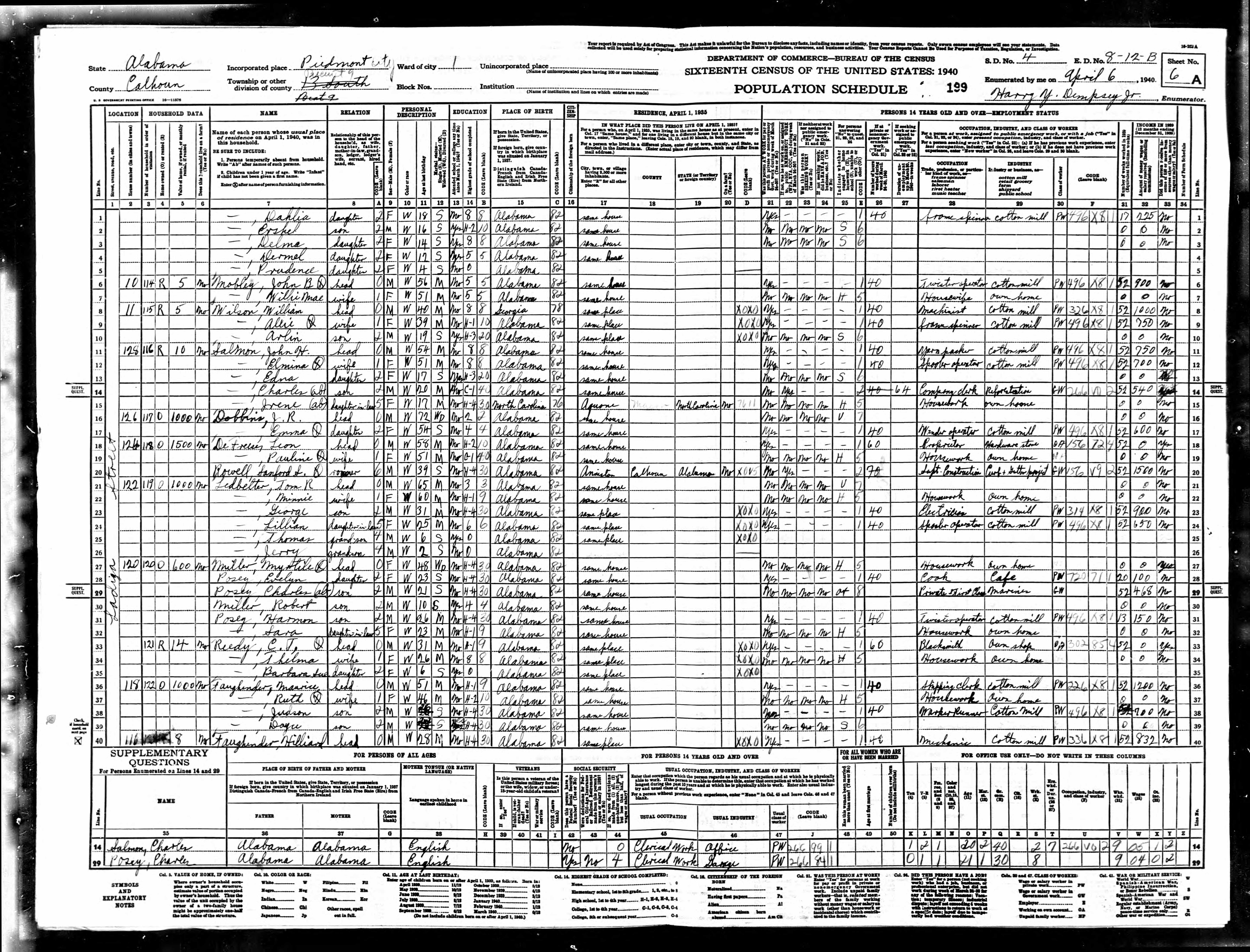 Residences1888 - Piedmont, Alabama | 1900 - Rabbittown, Calhoun, Alabama 1910 - Piedmond, Calhoun, Alabama 1920 - Piedmont, Calhoun, Alabama 1966 - Lubbock, Lubbock, Texas, USA |