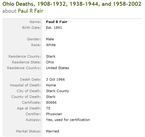Residences1896 - Ohio | 1900 - Sugar Creek, Stark, Ohio 1910 - Sugar Creek, Stark, Ohio 1920 - Bethlehem, Stark, Ohio 1930 - Bethlehem, Stark, Ohio |