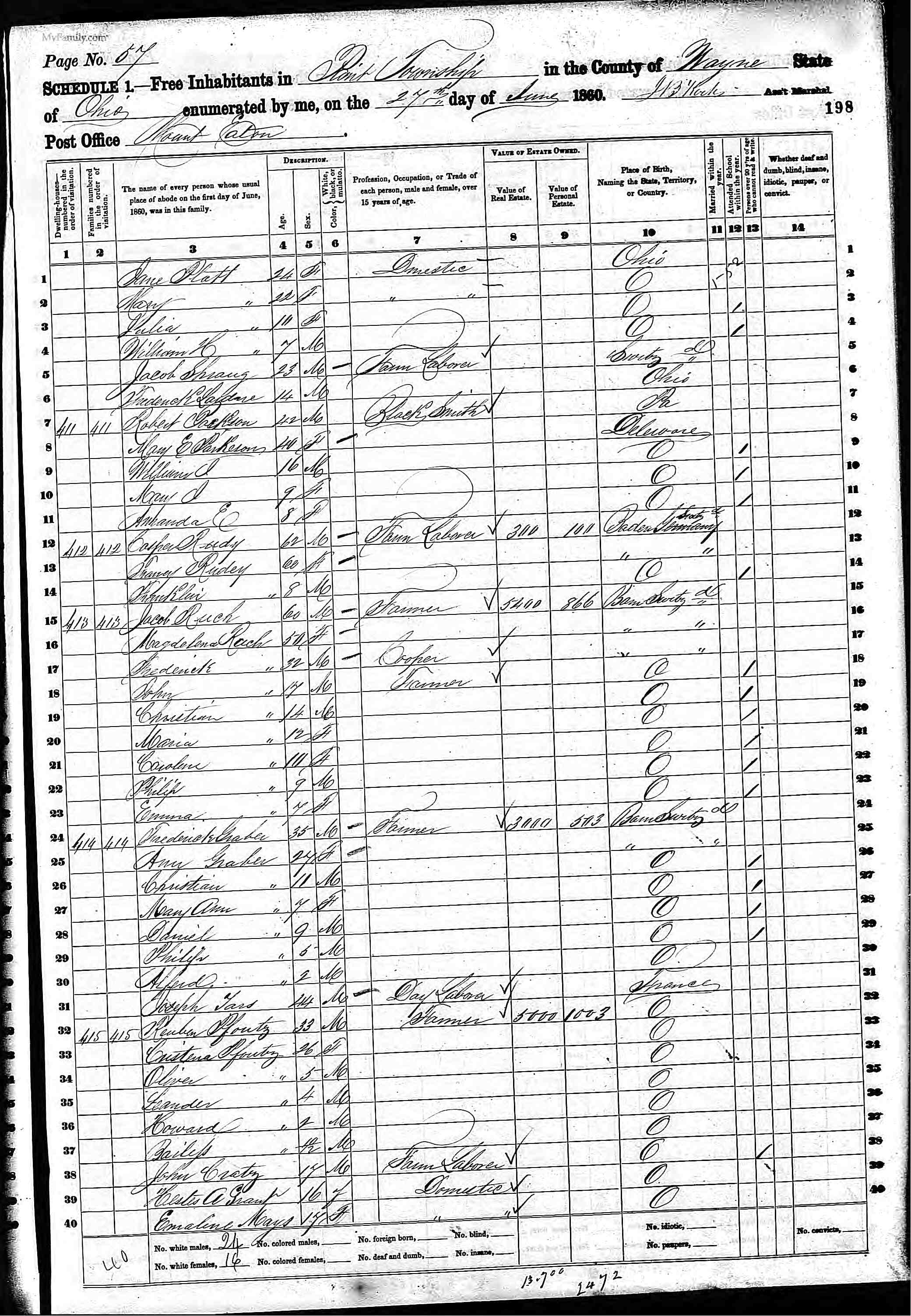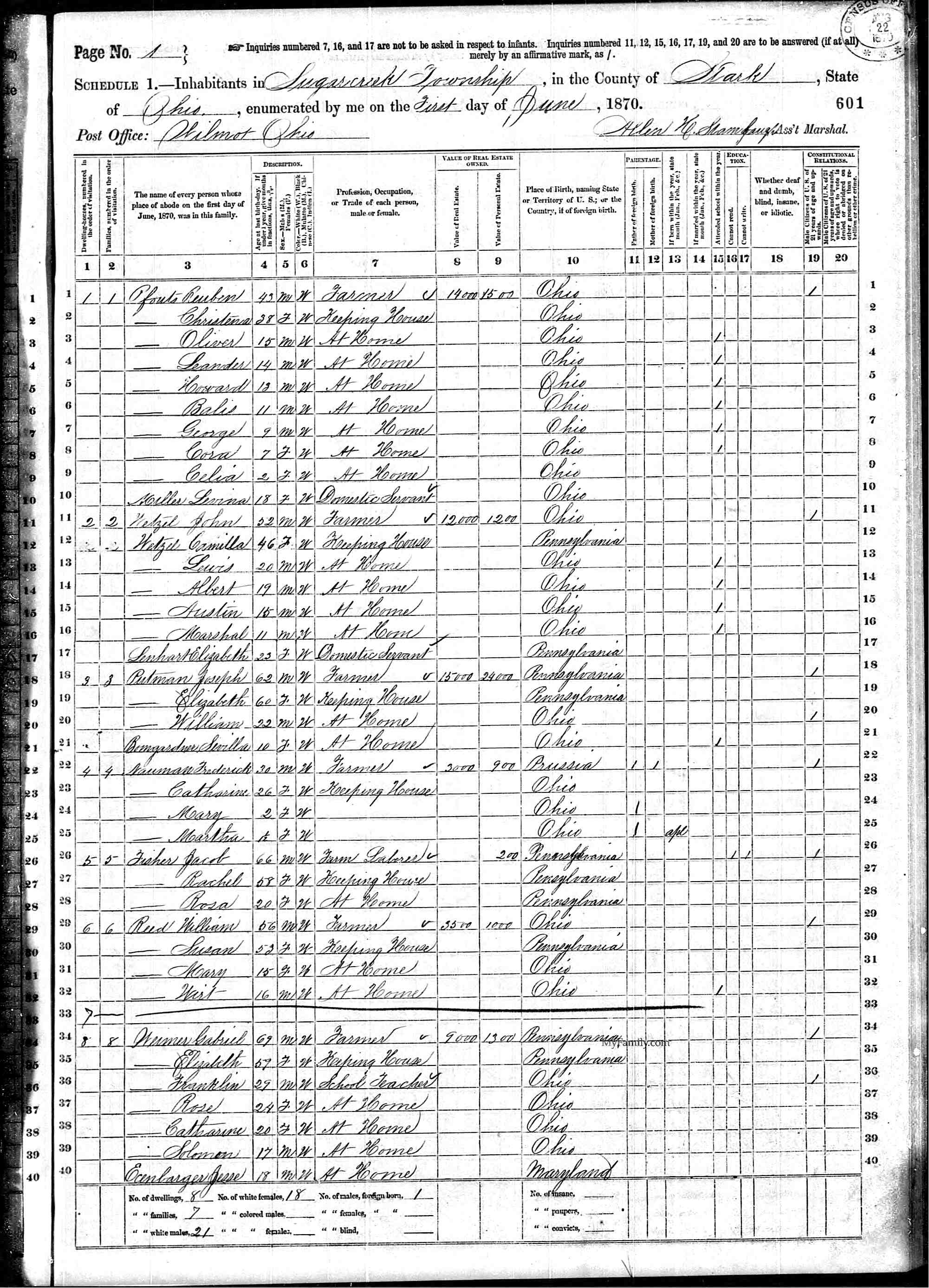 Residences1857 - Ohio | 1860 - Paint, Wayne, Ohio 1870 - Sugar Creek, Stark, Ohio 1880 - Canton, Stark, Ohio 1900 - Burton, Geauga, Ohio 1910 - Burton, Geauga, Ohio |