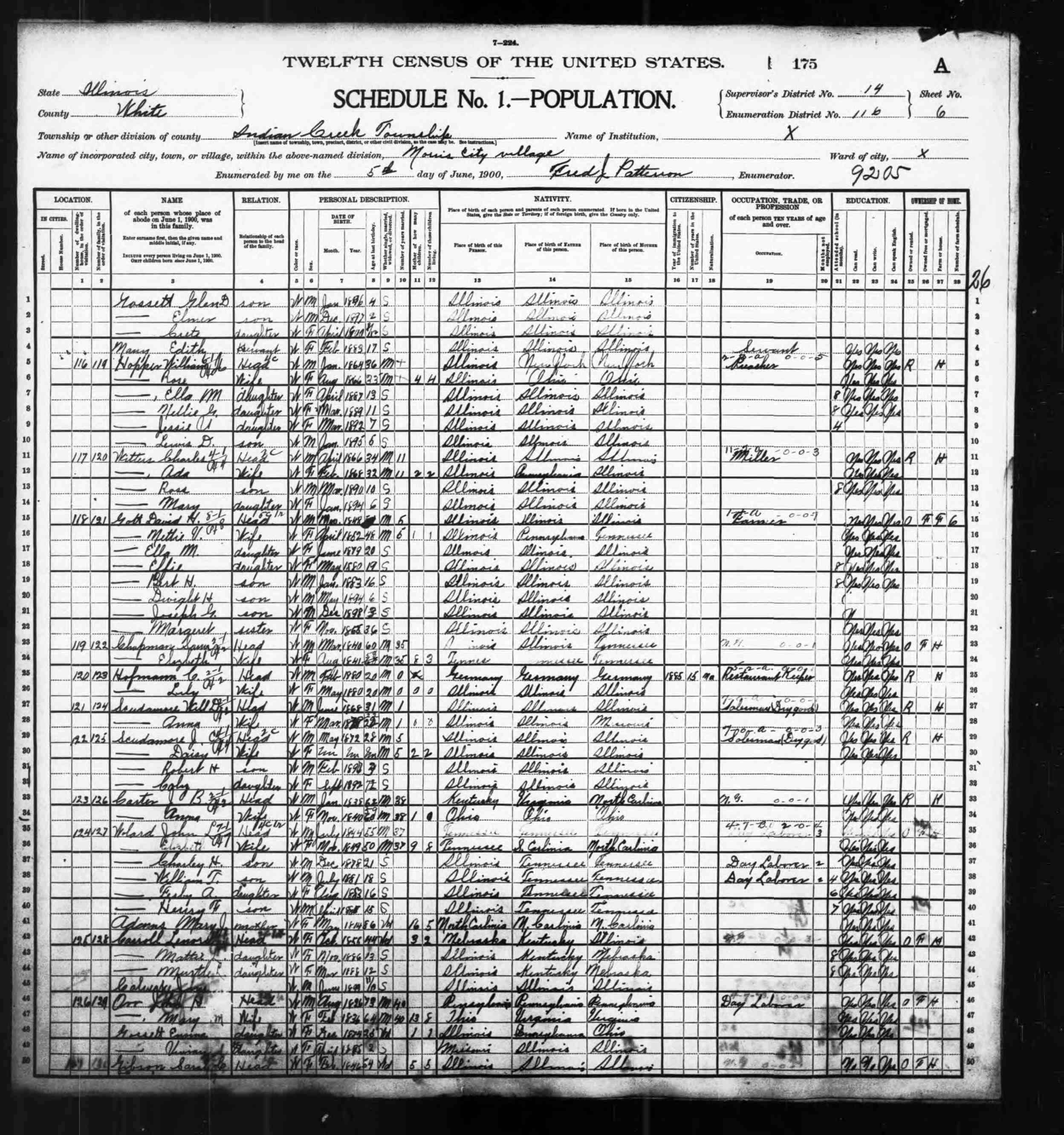 Residences1826 - Armstrong, Pennsylvania | 1850 - Wellsville, Columbia, Ohio 1860 - White, Illinois 1870 - Indian Creek, White, Illinois 1880 - Indian Creek, White, Illinois 1900 - Indian Creek, White, Illinois 1910 - Carmi, White, Illinois |