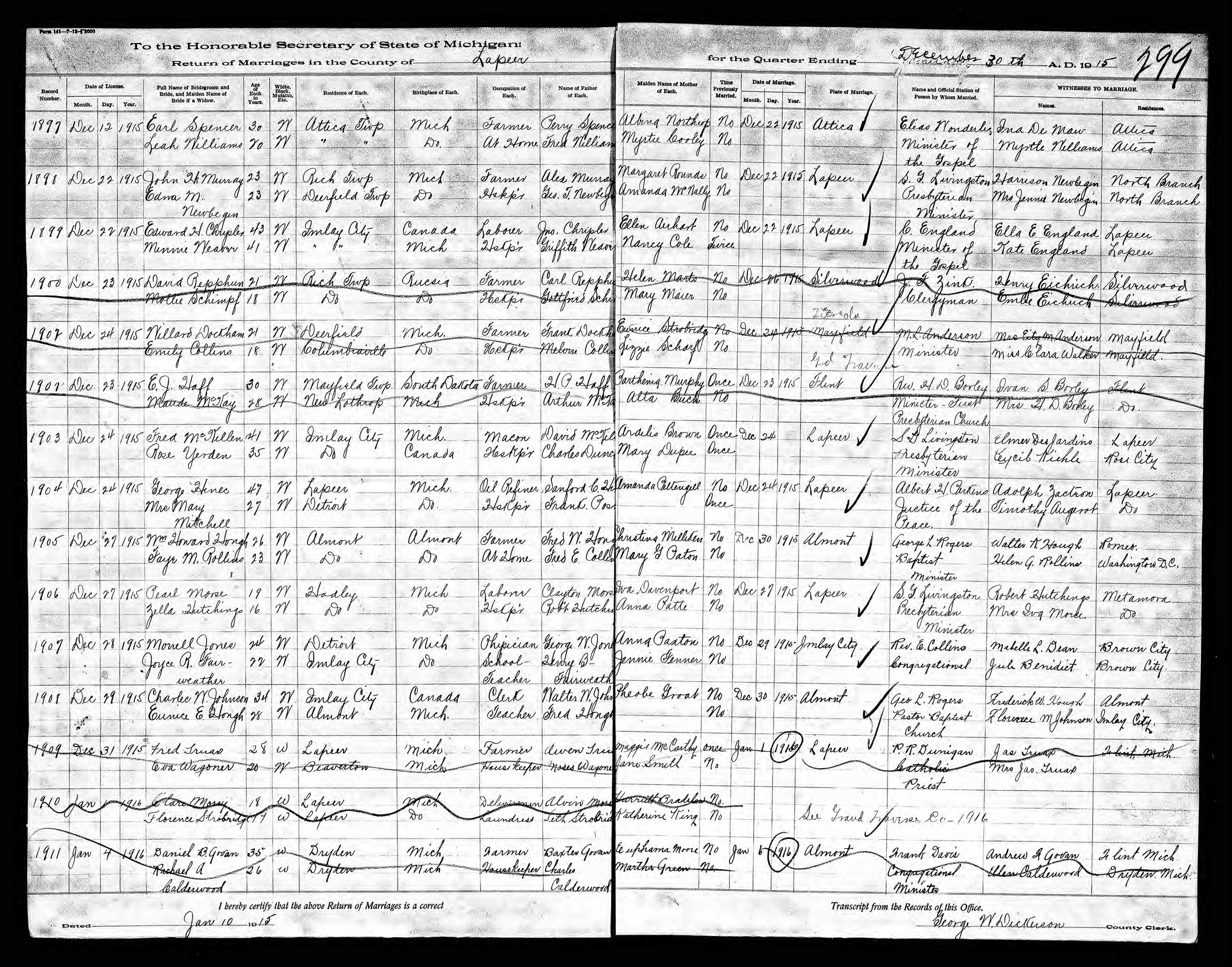 Residences1892 - Michigan | 1900 - Almont, Lapeer, Michigan 1910 - Washington, District Of Columbia 1920 - Almont, Lapeer, Michigan 1930 - Almont, Lapeer, Michigan |